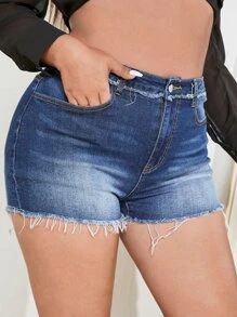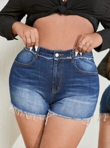Denim Shorts mit hoher Taille, Bleichen Waschung, rohem Saum