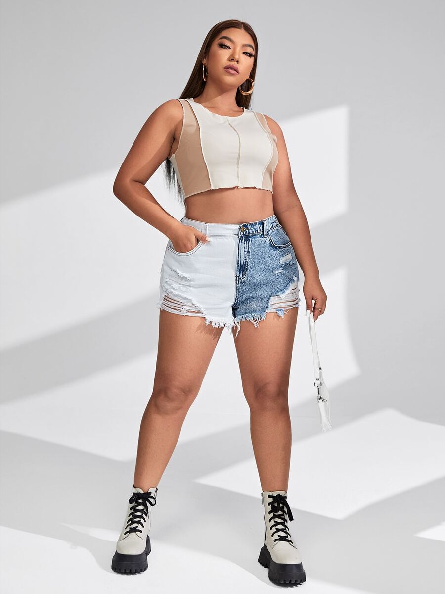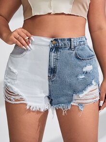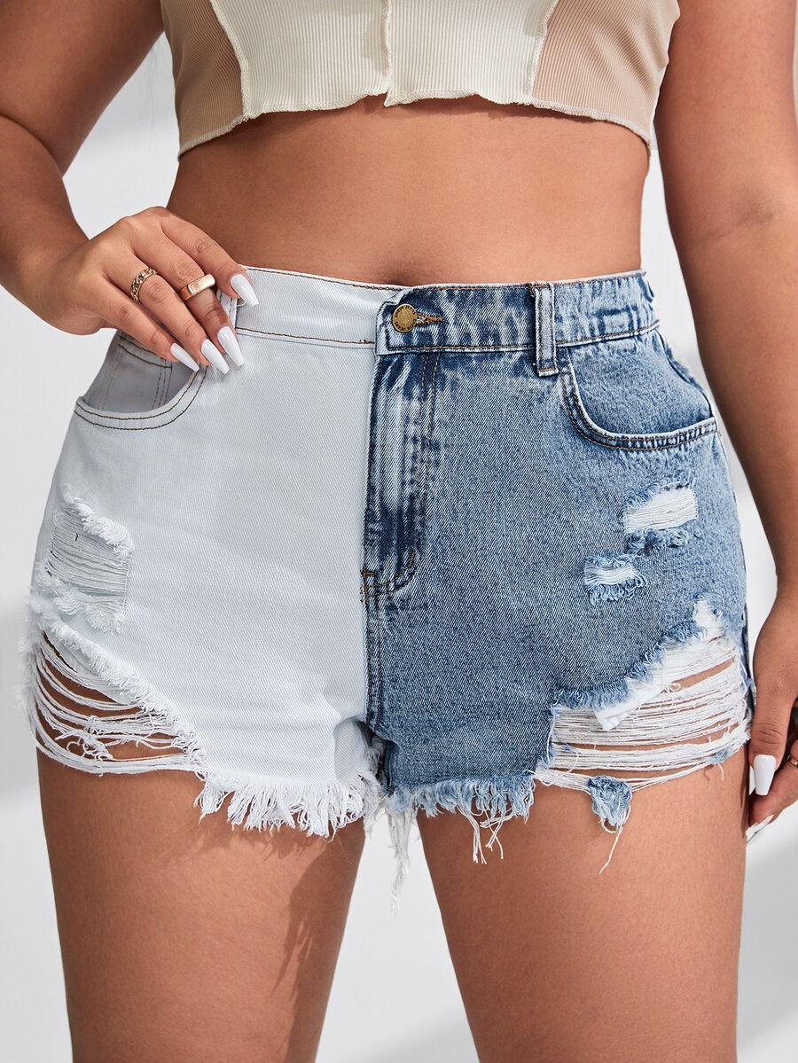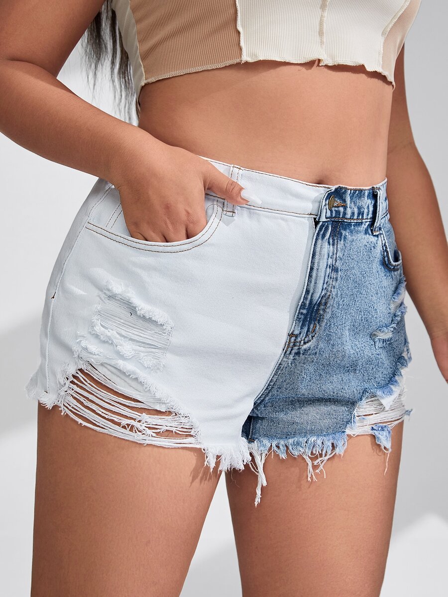 Denim Shorts mit hoher Taille, Riss, ausgefranstem Saum