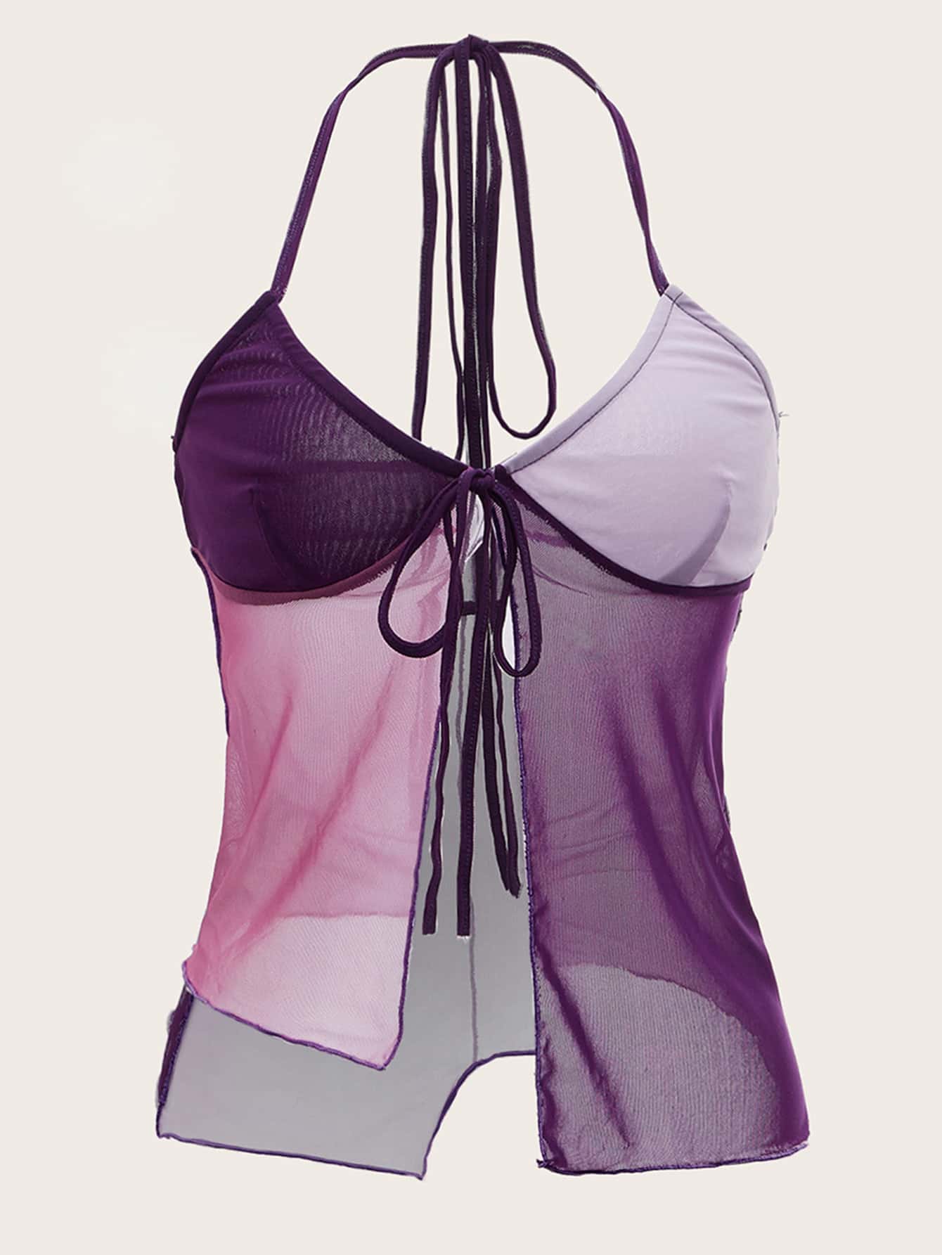 Trägertop mit Knoten, asymmetrischem Saum, Kreuzgurt auf Rücken, Mesh