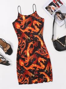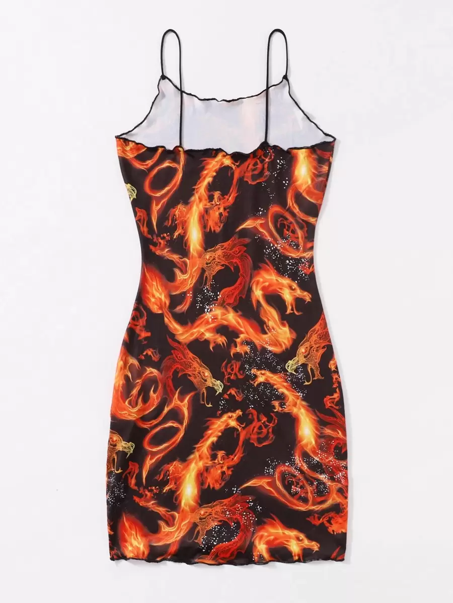 Cami Kleid mit Wellensaum, Feuer & chinesischem Drachen Muster