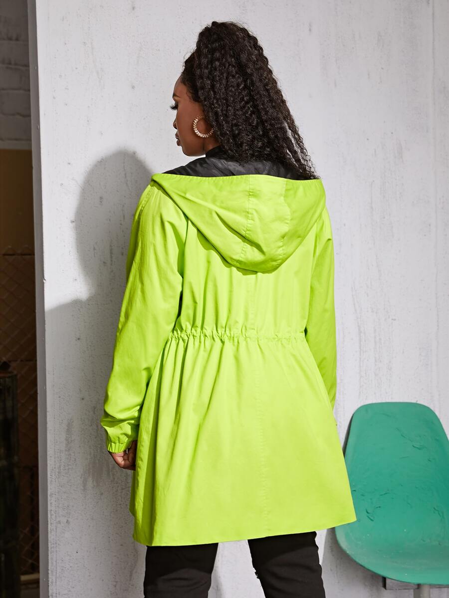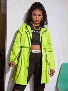 Neon grüner Mantel mit Kordelzug um die Taille und Kapuze