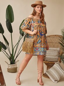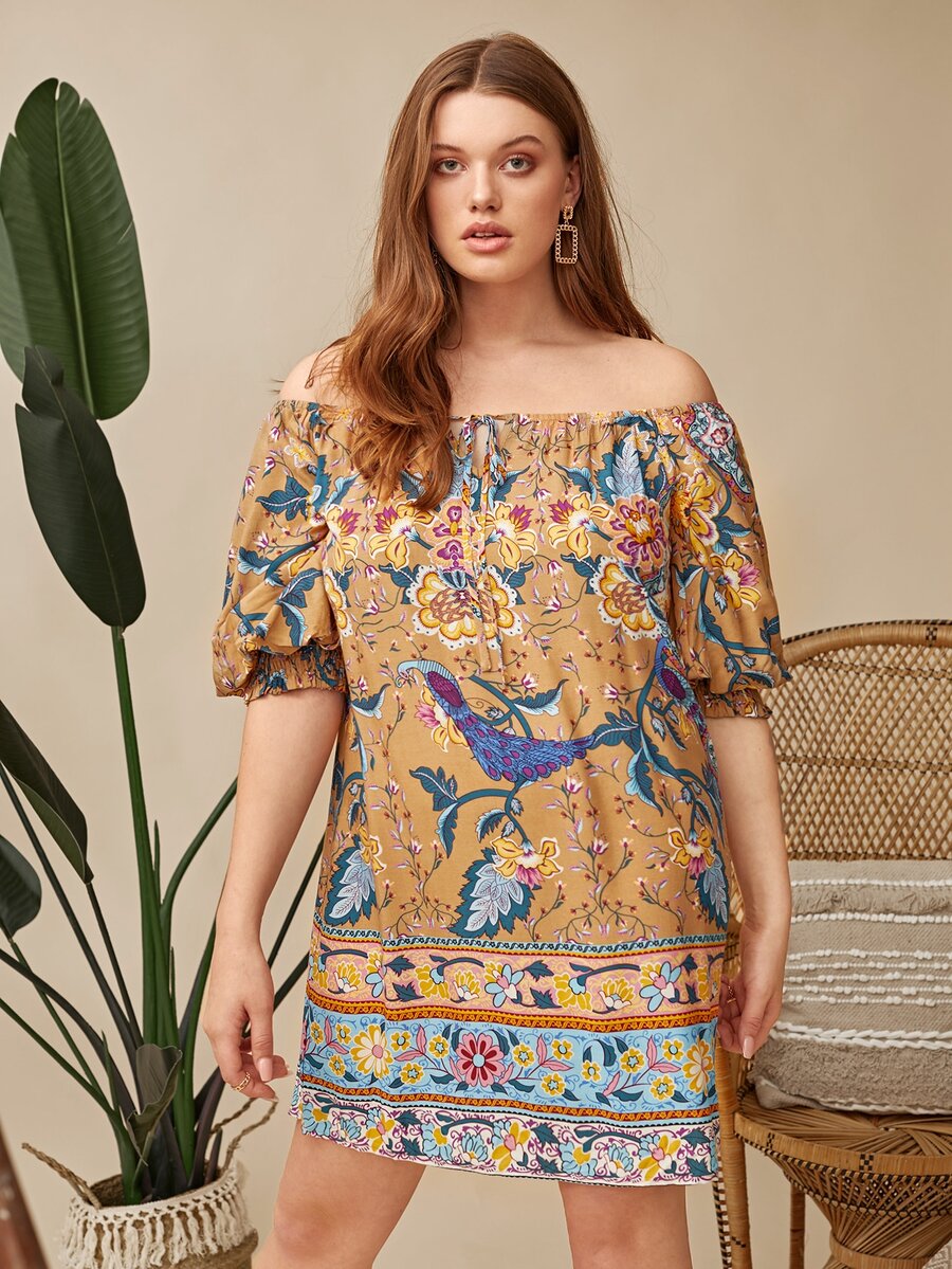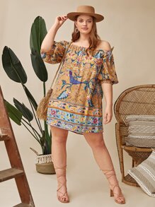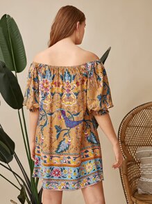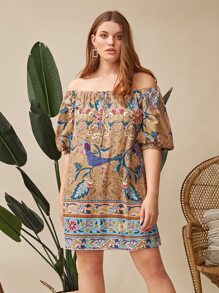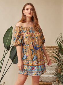 Schulterfreies Kleid mit Laternenärmeln und Blumen Muster