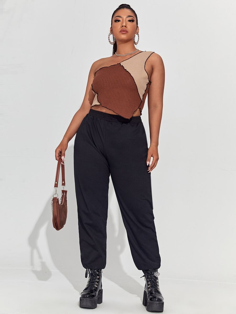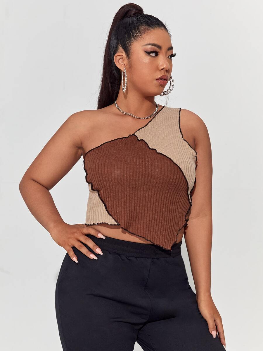 Top mit einer Schulter frei, Stich Besatz und Farbblock