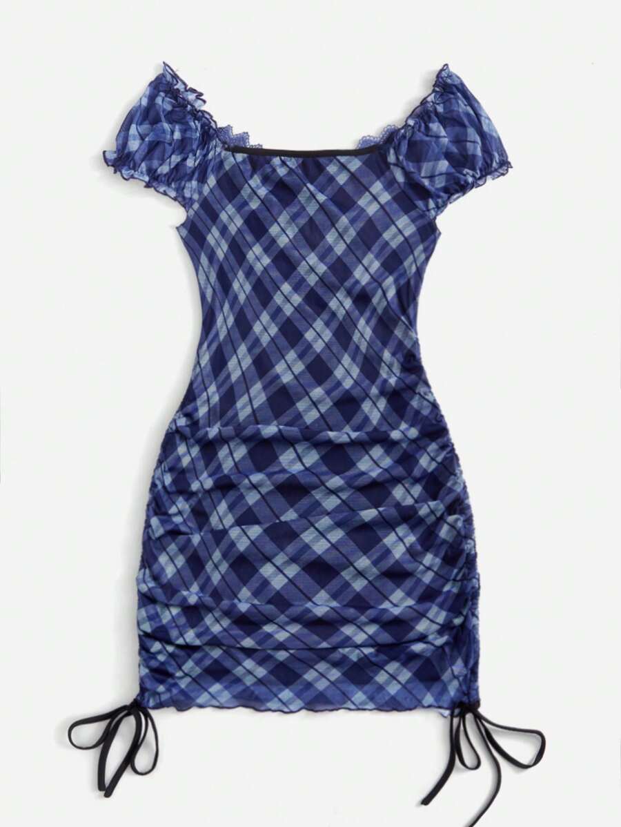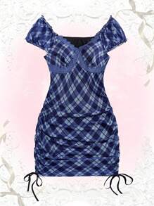 Figurbetontes Kleid mit Plaid Muster, seitlichem Schnürzug,