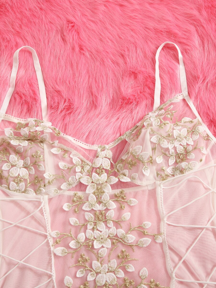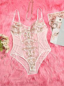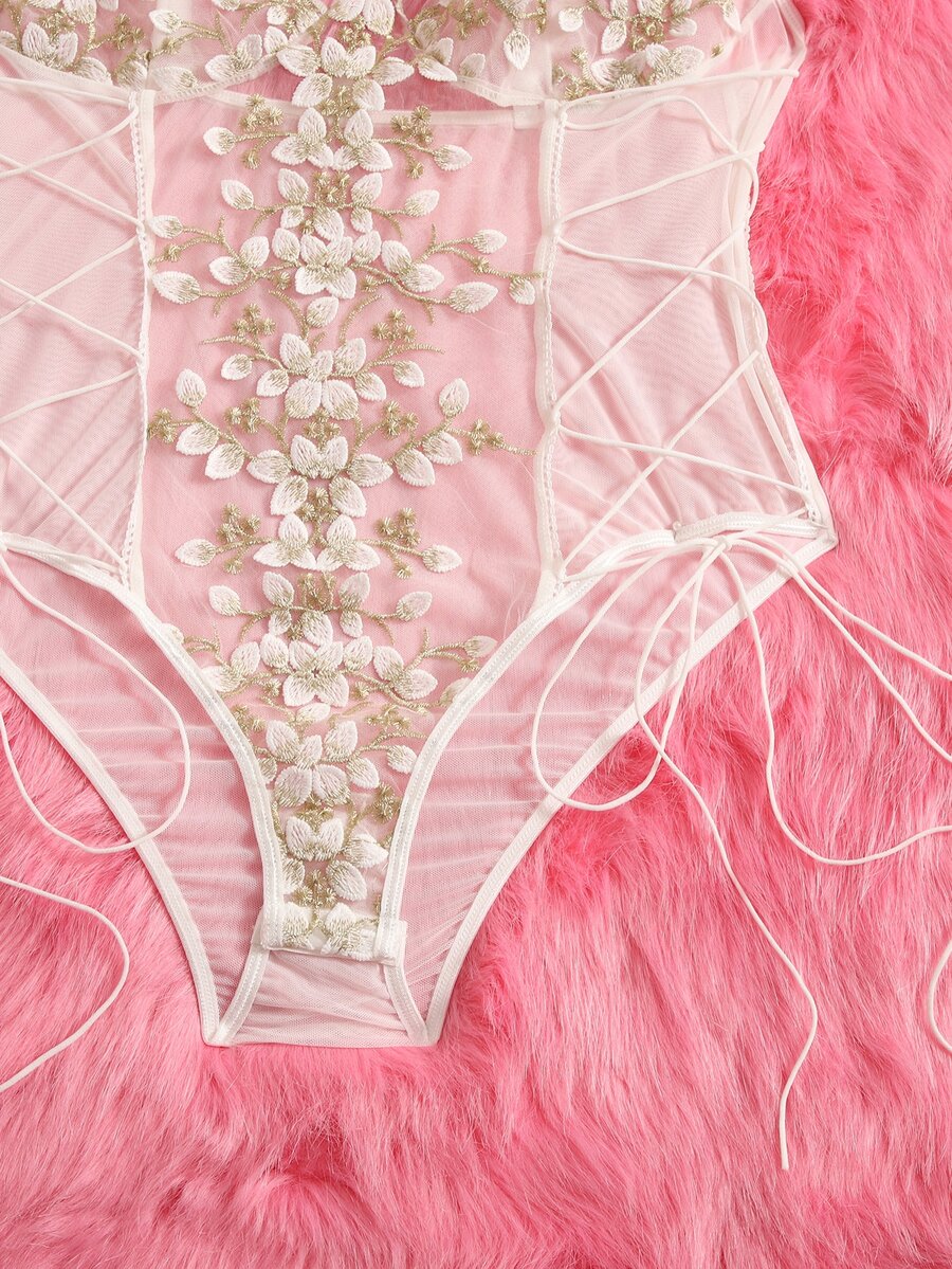 Teddy Body mit Pflanze Stickerei, transparentem Netz, Schnürung