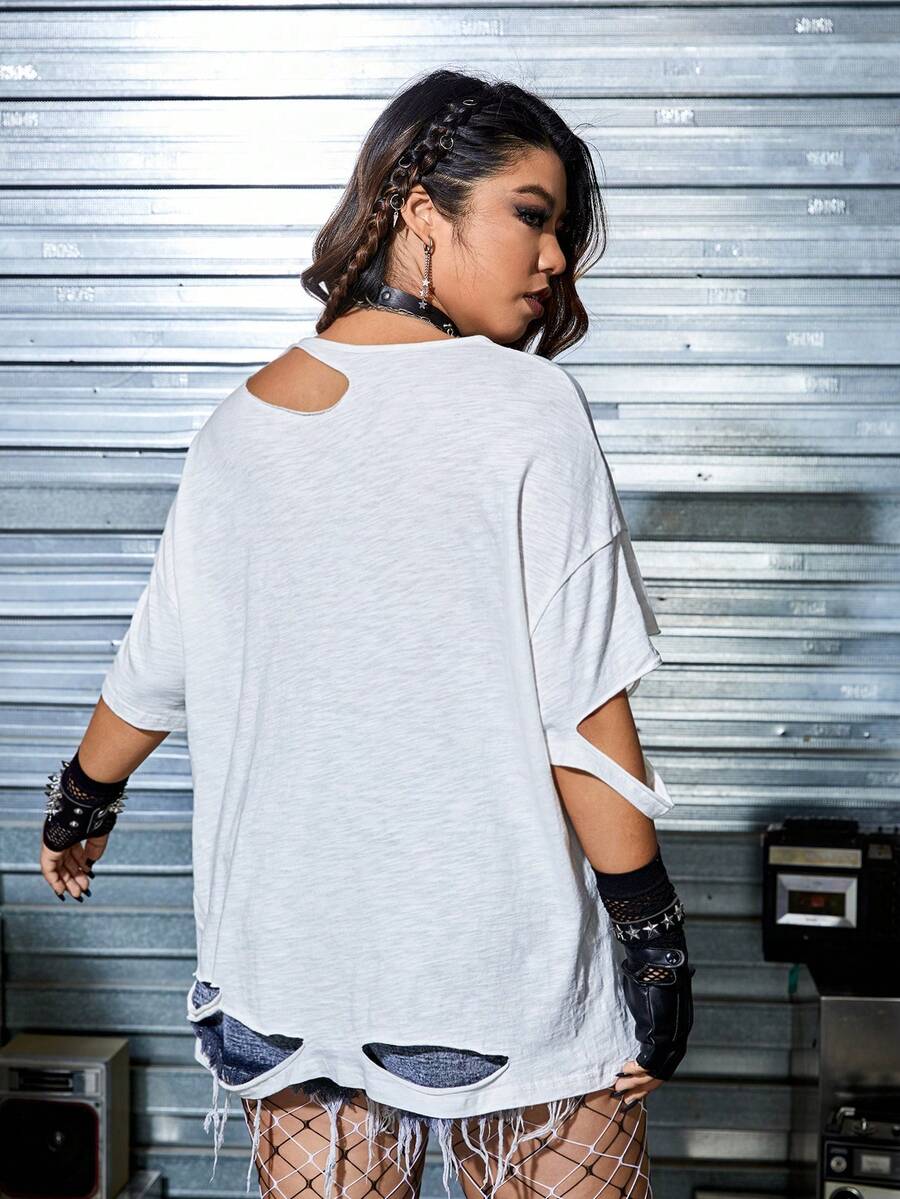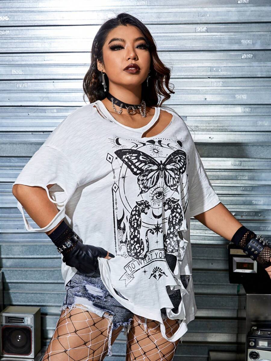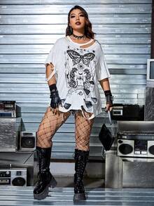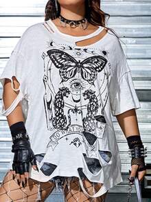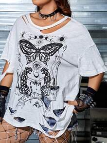 Rock Schmetterling & Figur Grafik Ripped Drop Shoulder T-Shirt