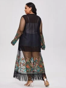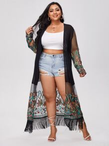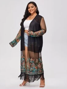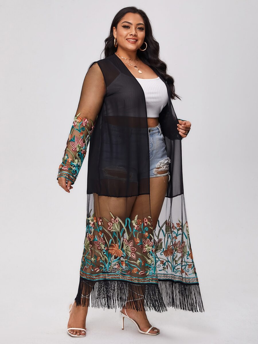 Große Größen durchsichtiger Mesh Kimono mit floraler Stickerei und Fransen, für Sommerstrand Urlaub
