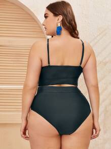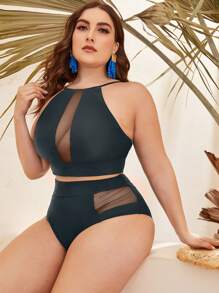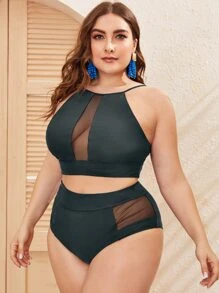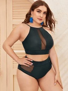 Kontrastierender Netz-Bikini-Badeanzug mit hohem Kragen in großen Größen, Sommer-Strandmode