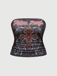 Große Größen Y2K Gothic Rock Kreuz & Flügel Bedrucktes Damen Herbst Top T-Shirt, Große Größen Schwarzes ärmelloses bedrucktes Crop T-Shirt für den Herbst