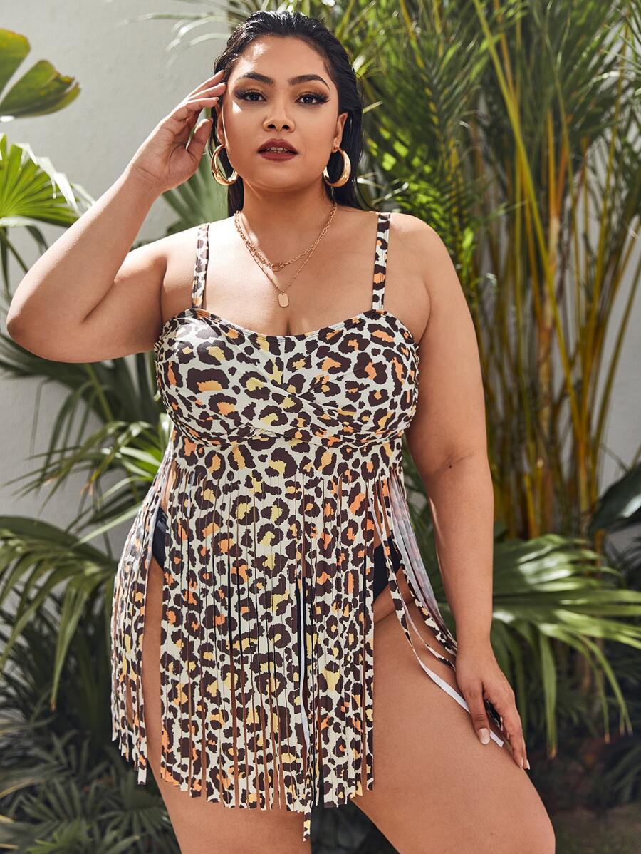 Große Größen Leoprint Tankini mit Fransen Saum für den Sommerstrand