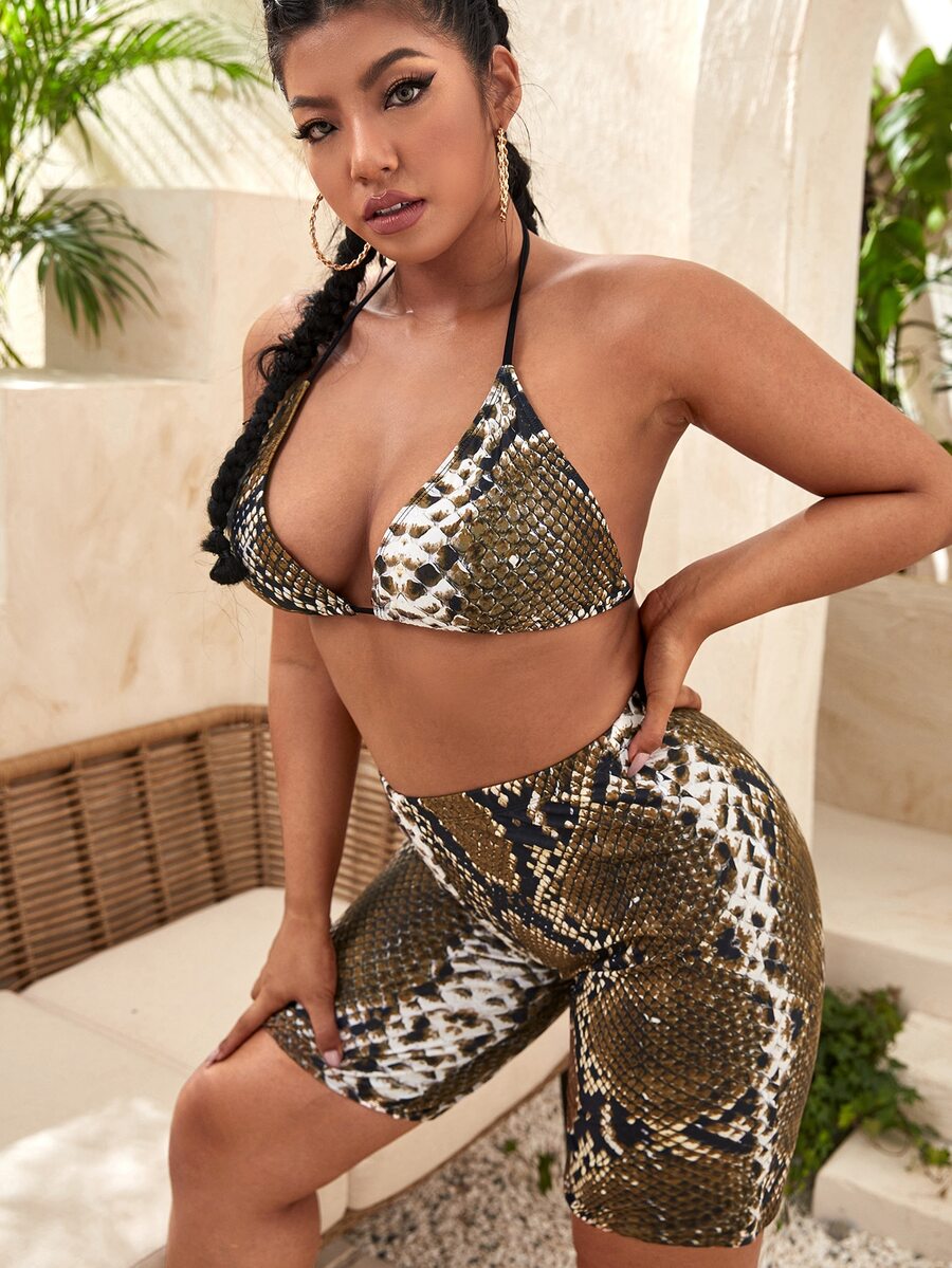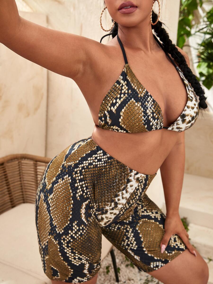 Große Größen Bikini-Set mit Shorts und Trägertop in Schlangenhaut Musterung, Sommer Strand