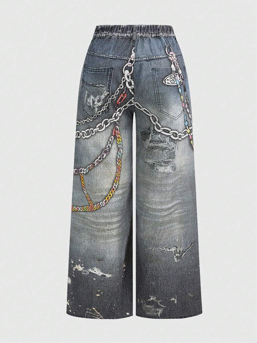 Grunge Punk Jeans in Große Größen für Frauen im Grunge-Punk Y2K Soft Girl Retro Lässig Stil mit Motorrad-Ketten-Dekor-Muster