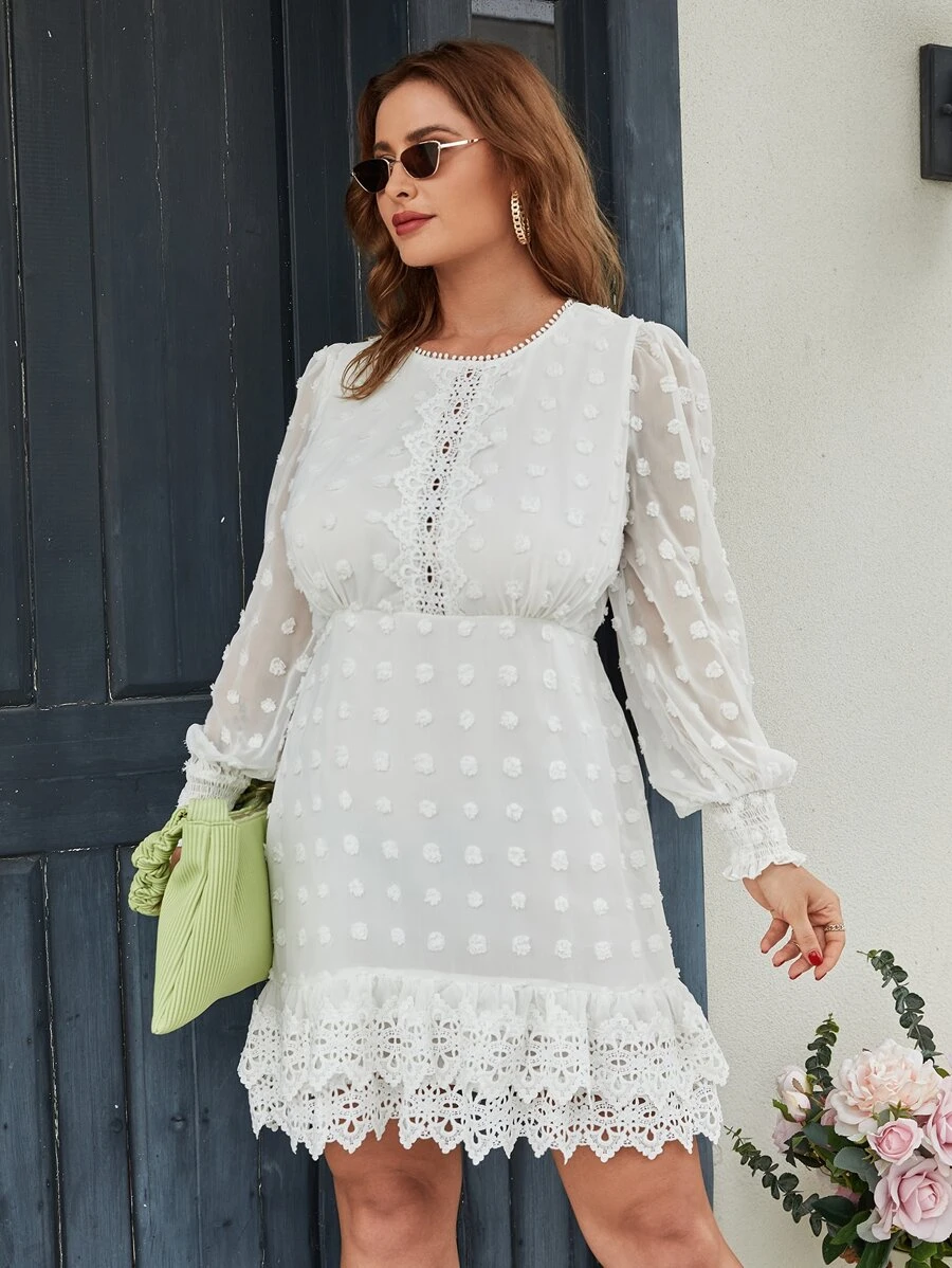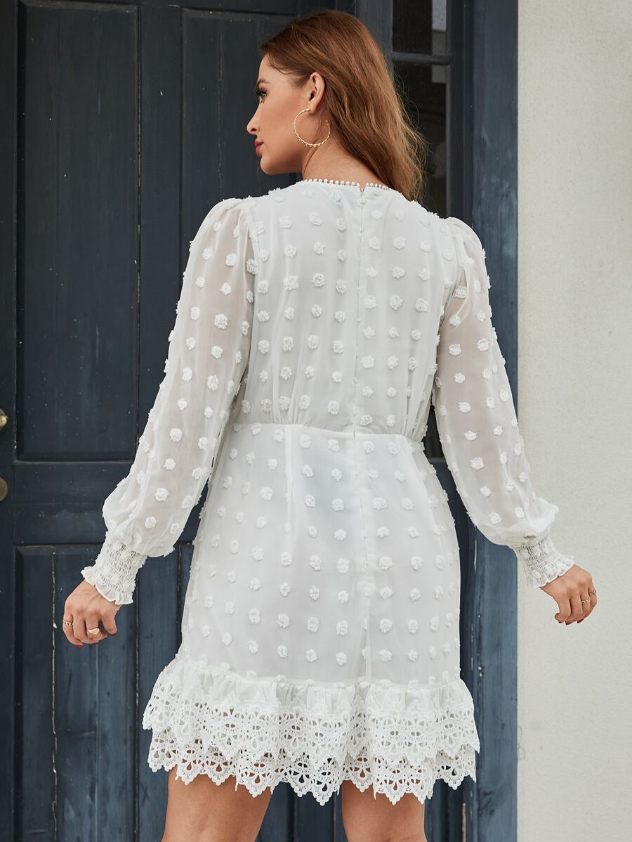 Kleid mit Punkten, Luftspitze Applikation, Rüschen, Laternenärmeln, Chiffon