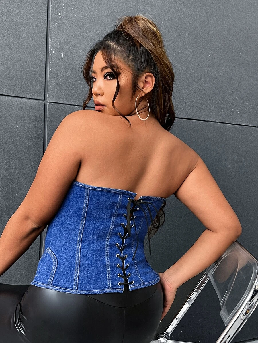 Denim Top mit Reißverschluss vorn, Öse, Band hinten, asymmetrischem Saum, Tube