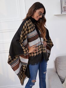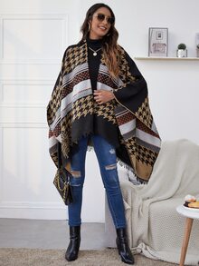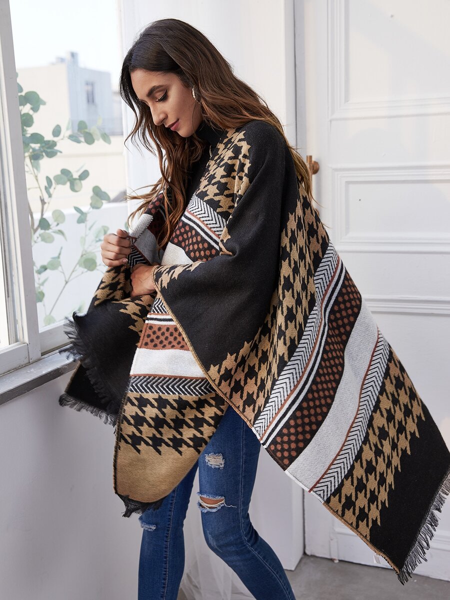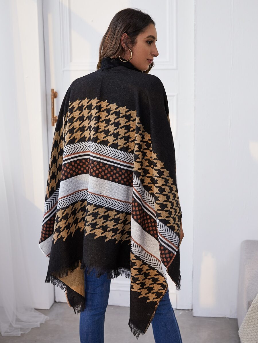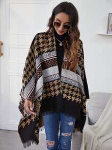 Strickjacke mit Punkten & Hahnentritt Muster, Fransen und Cape