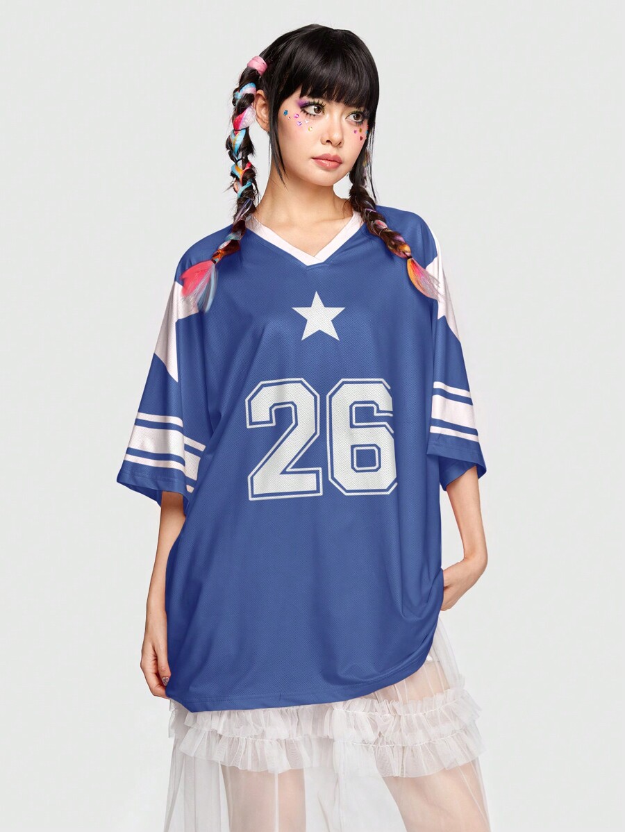 ROMWE Avant Lässiges, süßes T-Shirt mit Stern- und Zahlen-Muster, kurzärmlig, Schule