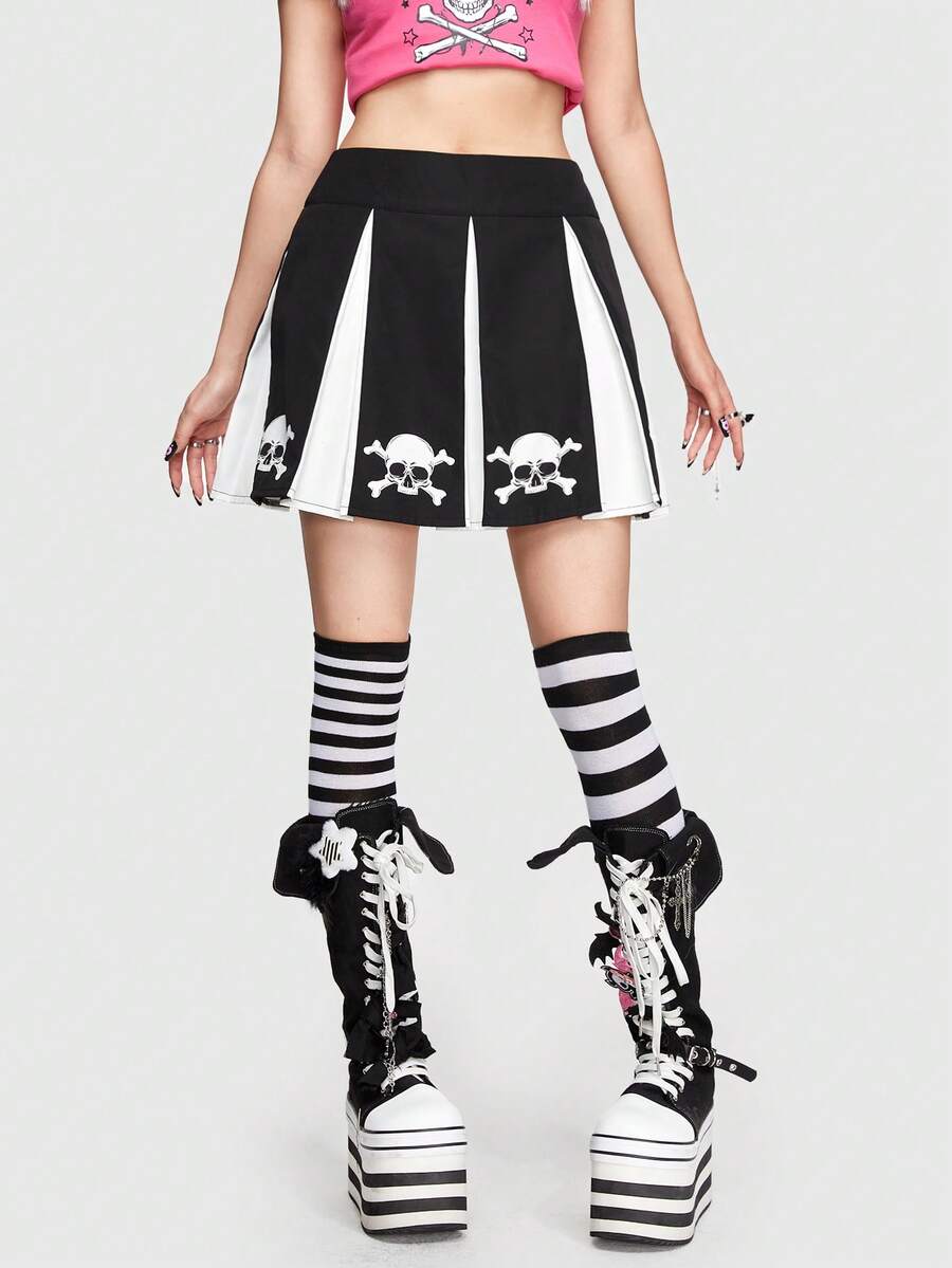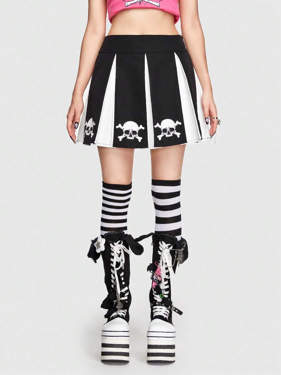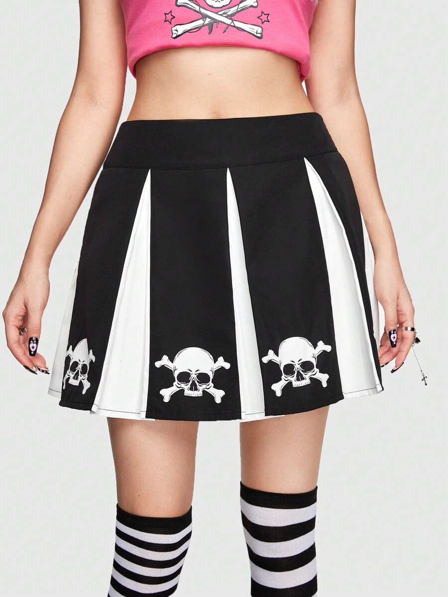 ROMWE Avant Gegensätzlich Farbener Plissierter Rock Mit Totenkopf Druck