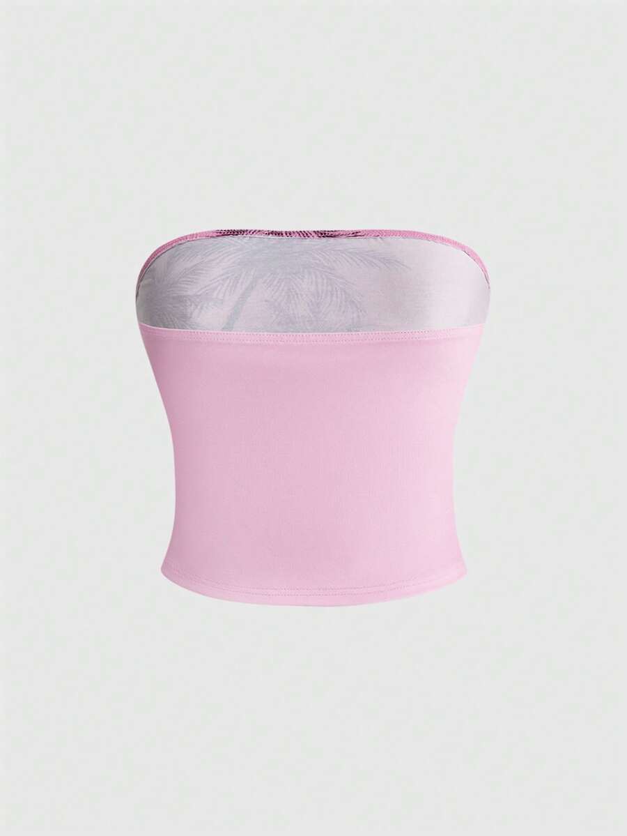ROMWE Avant Insel-Urlaubsstil Hibiskus, Palme, Sonnenuntergang, rosa Meer Strass Muster Y2K Damen Top
