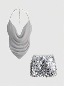 ROMWE Avant Neujahrs-Party Metall-Drapierte Weste & Ultratief Taillierter Mini Bodycon Rock 2-teiliges Set für Frauen