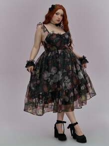 ROMWE Avant Große Größen Vintage romantisches Palast Blumen Kleid mit Flügelärmel aus transparentem Chiffon, Urlaubsstil
