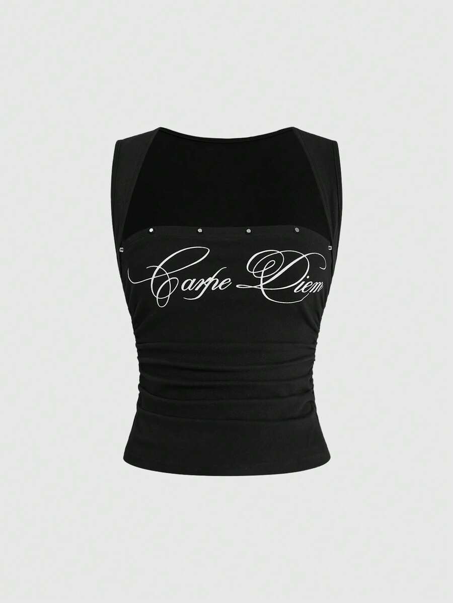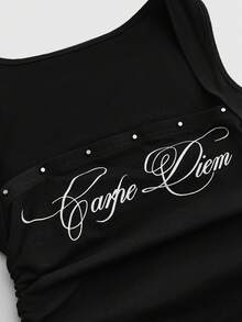 ROMWE Avant Sexy Slogan-Muster Punk Nieten Tief Ausgeschnittenes Bodycon Gerafftes Trägerhemd