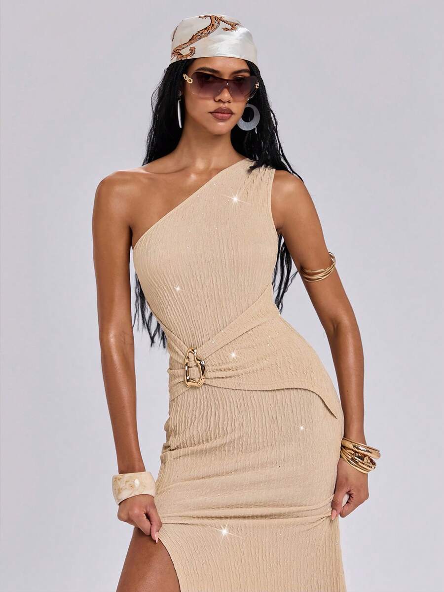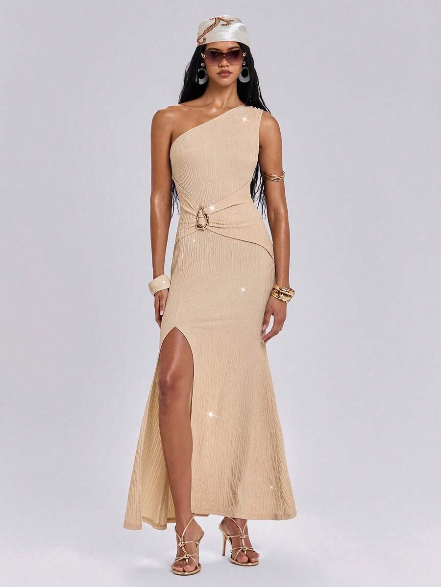 ROMWE Avant Damen Asymmetrisches Neckholder Kleid, glitzerndes elastisches Strick-Meerjungfrauenkleid mit hohem Schlitz, elegant, modisch, sexy, geeignet für Party, Hochzeit, Gala, Date, Musikfestival und verschiedene Anlässe