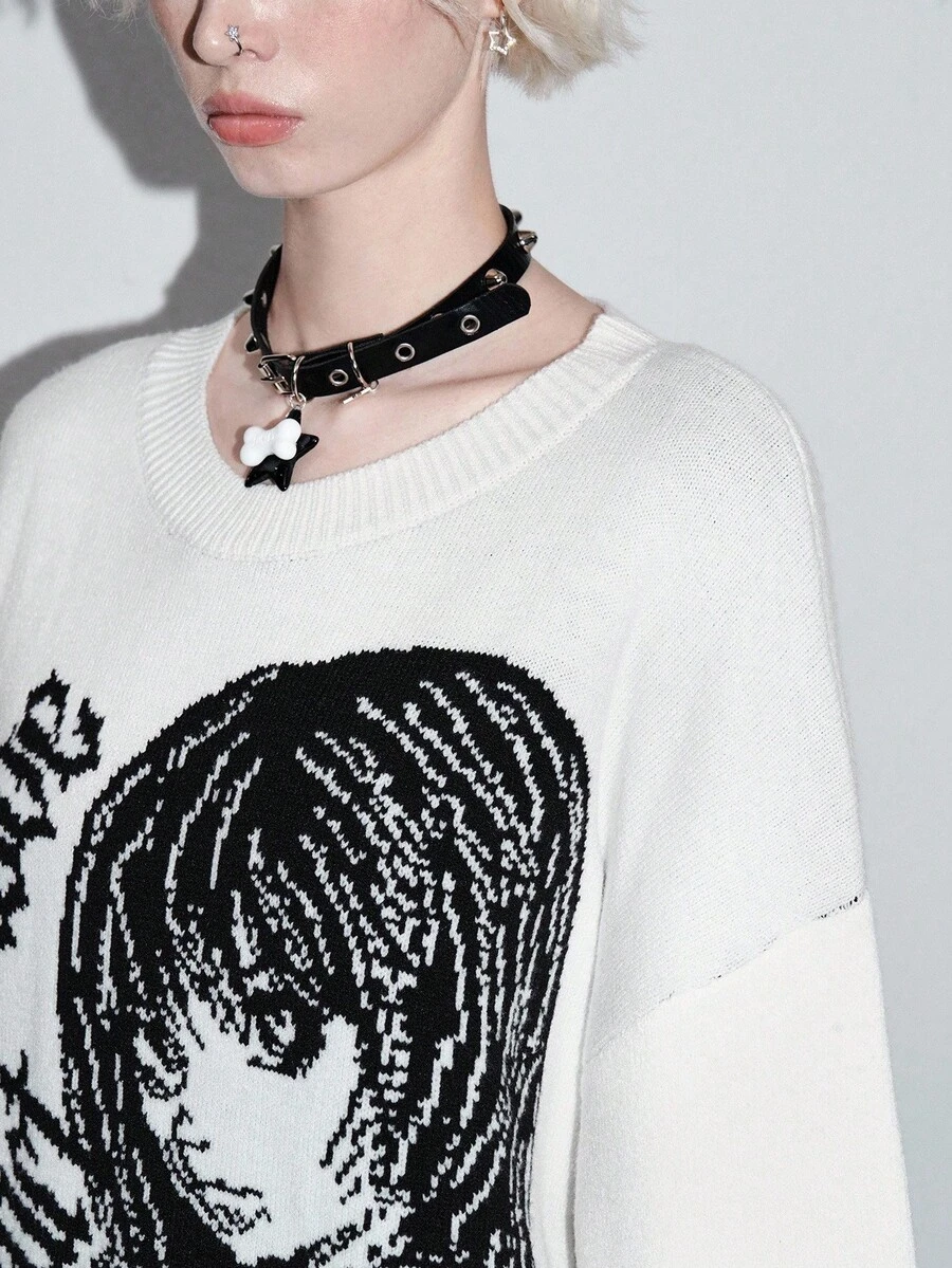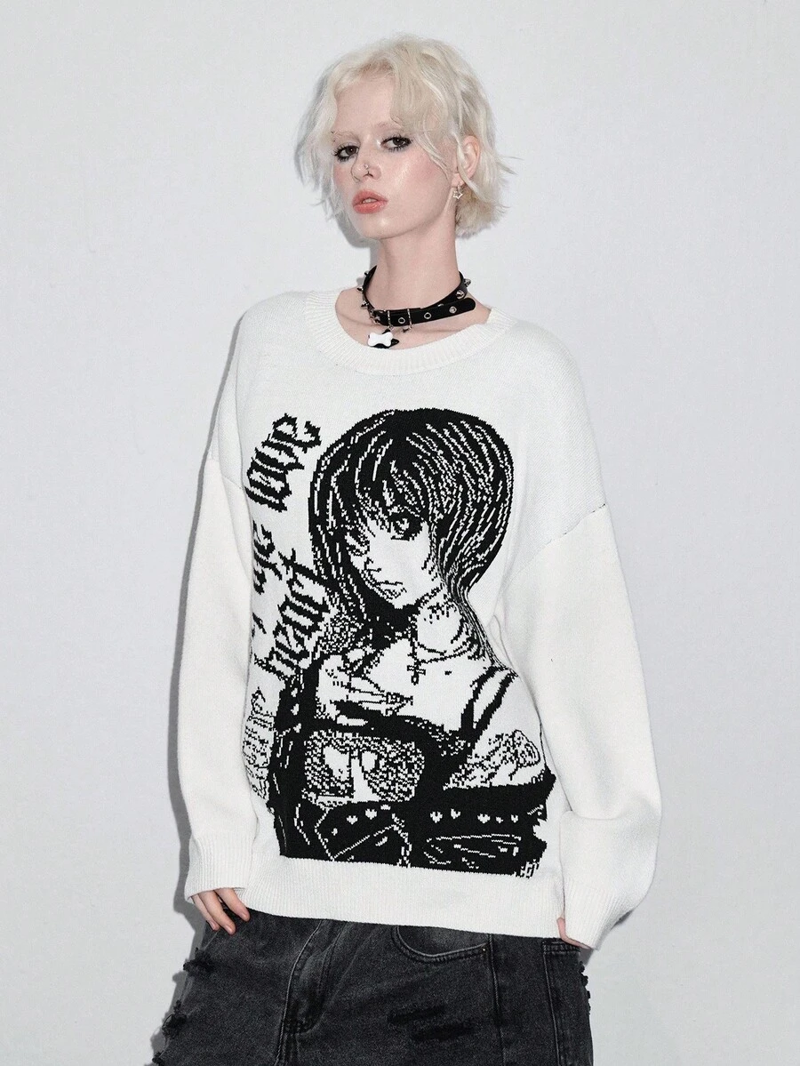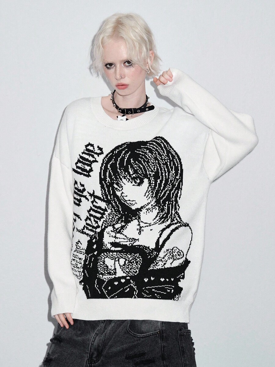 ROMWE Avant Unisex Y2K Cartoon Jacquard Pullover