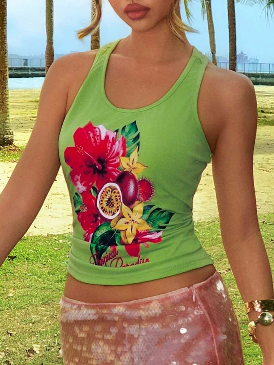 ROMWE Avant Damen Allround-Trägertop mit tropischem Obst- und Hibiskus-Muster