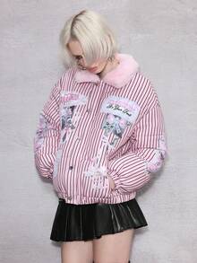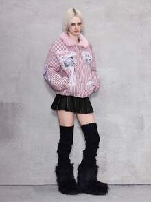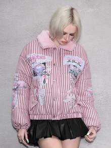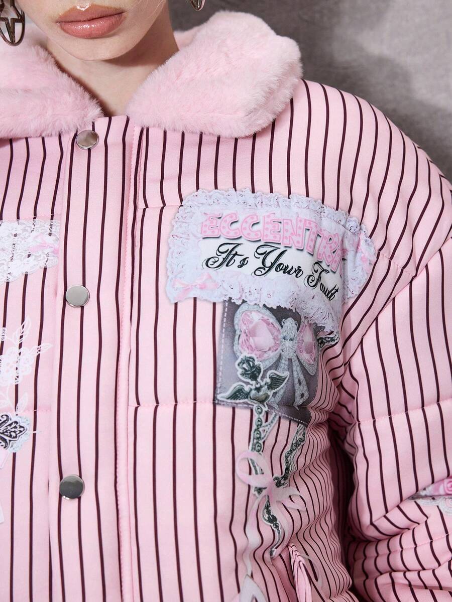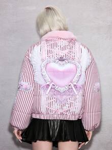 ROMWE Avant Damen Retro Süß Kawaii Ästhetik Schleife Herz Flügel Muster Plüsch Patchwork Gepolsterter Mantel, vielseitig