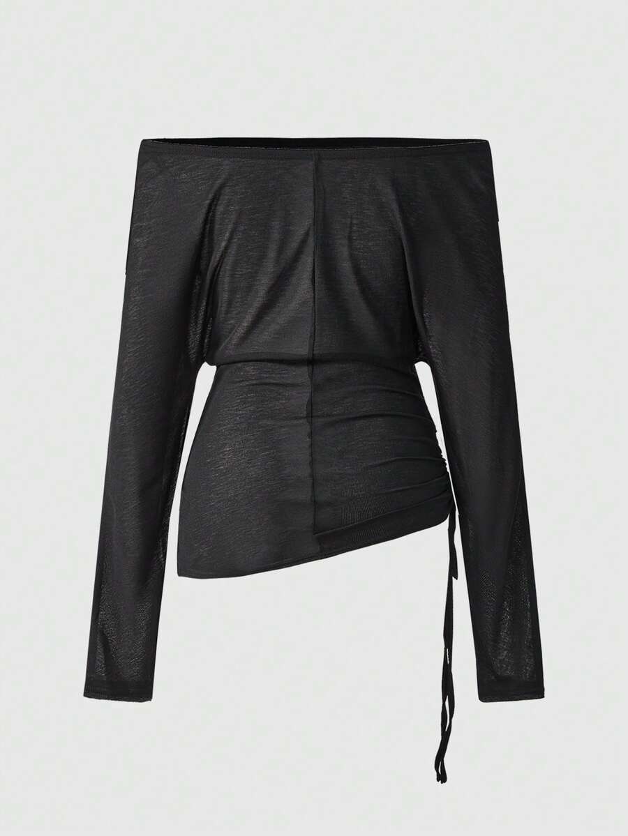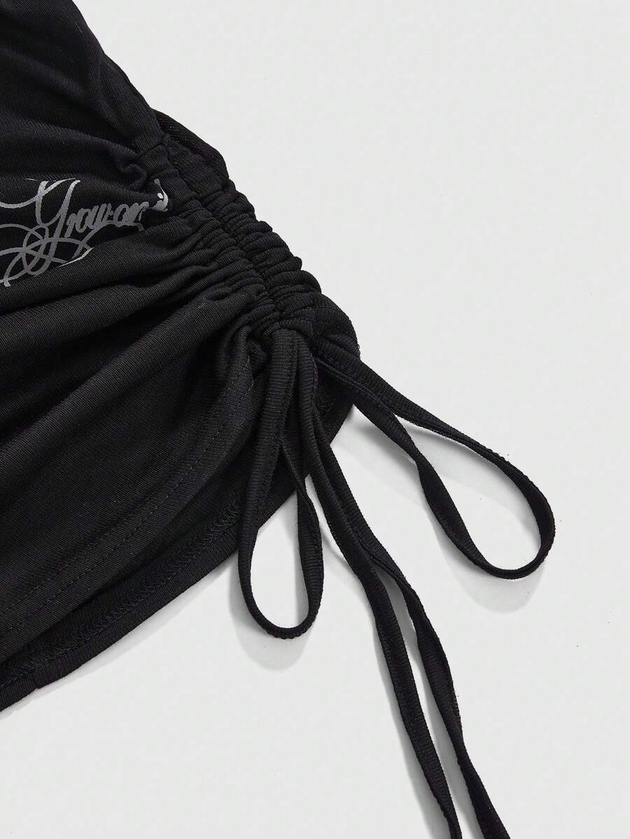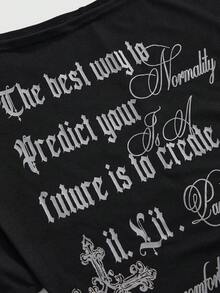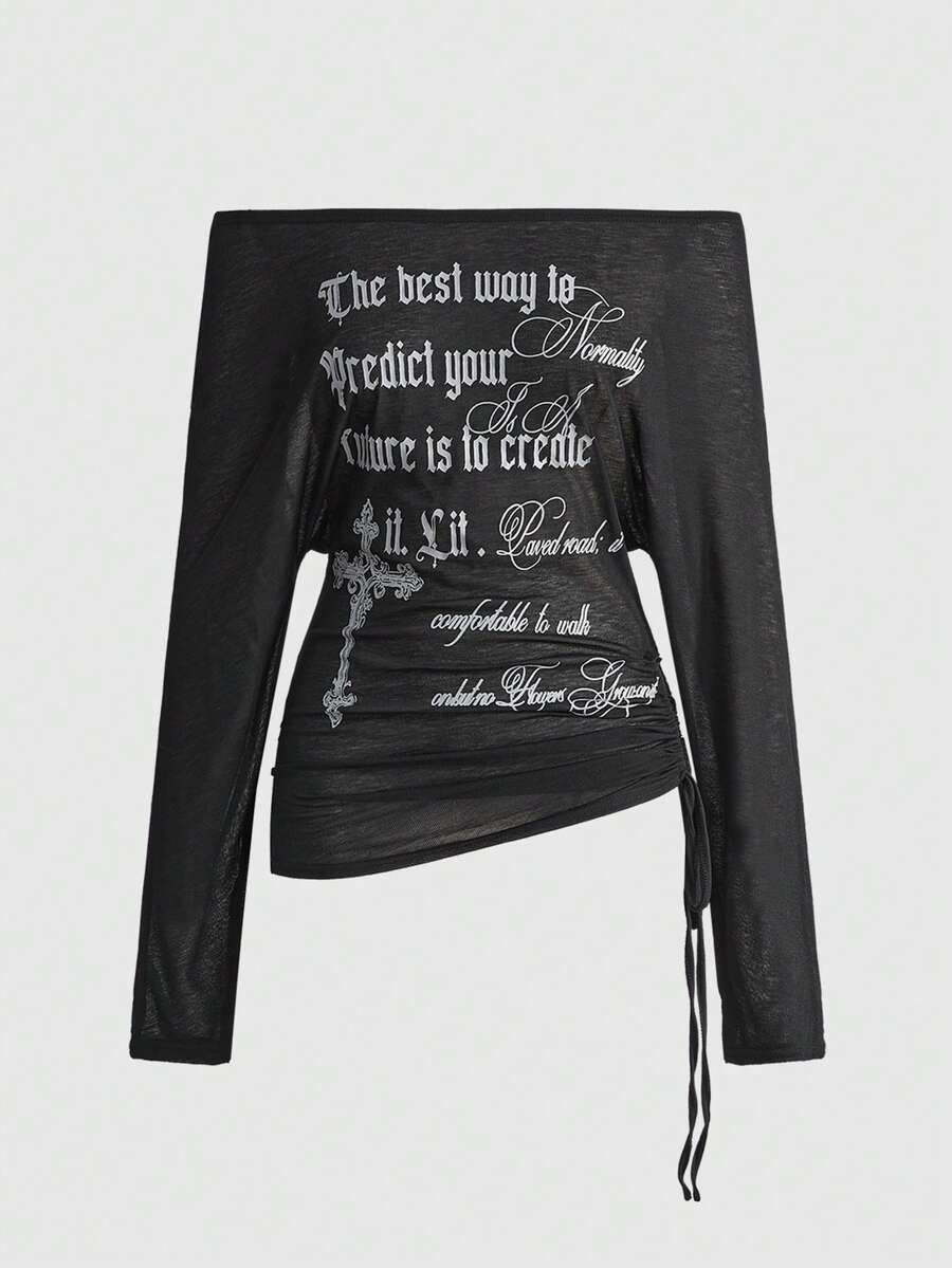 ROMWE Avant Damen Retro Y2K Baddie Romantisch Punk Kreuz Buchstaben Muster Off-Shoulder Langarm Transparentes T-Shirt Top
