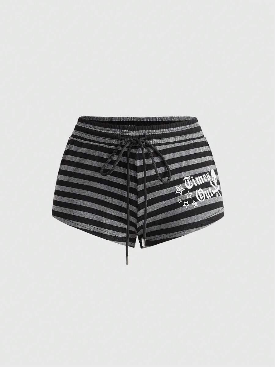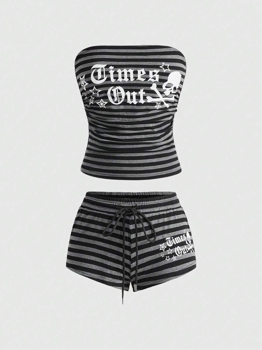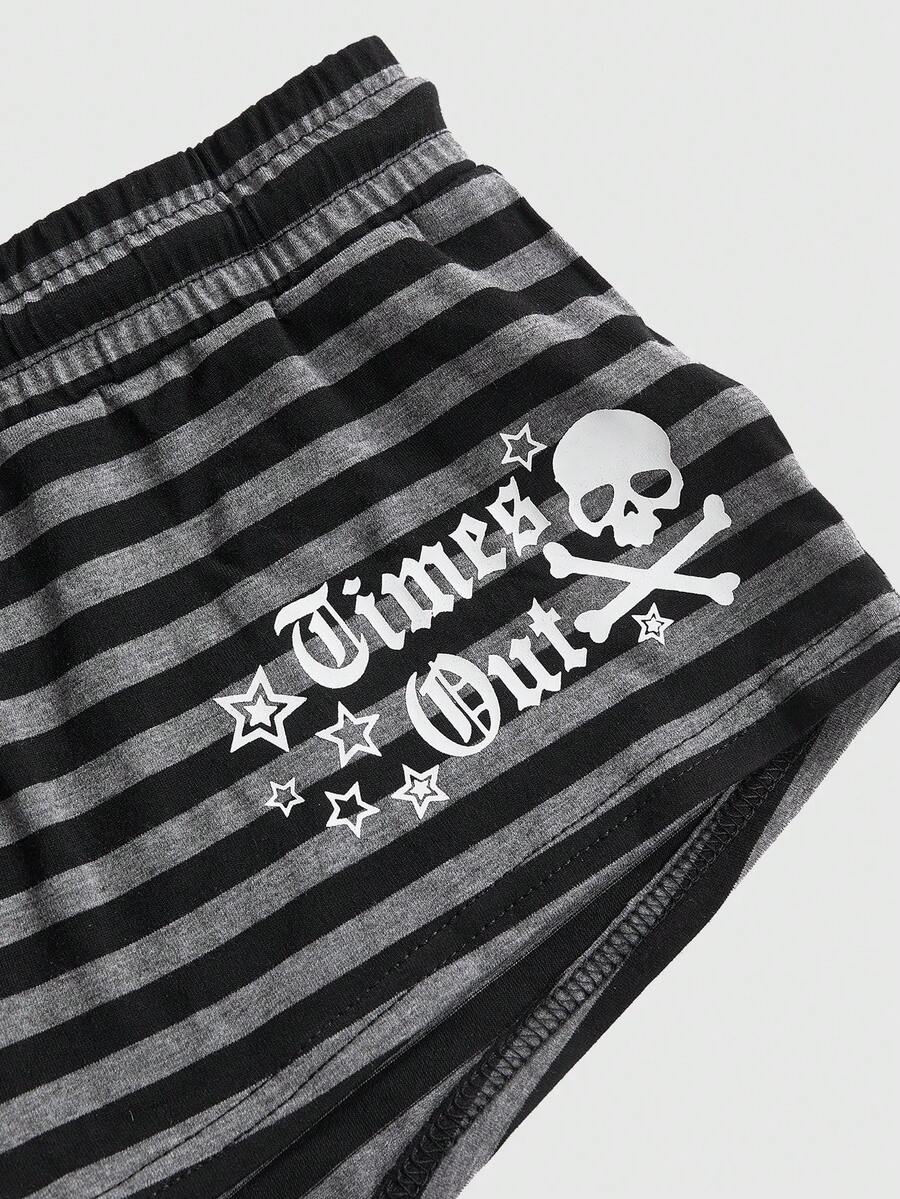 ROMWE Avant Damen Retro Y2K Baddie Slogan Totenkopf Muster gestreiftes Crop Top und super tief sitzende Mini Shorts 2-teiliges Set