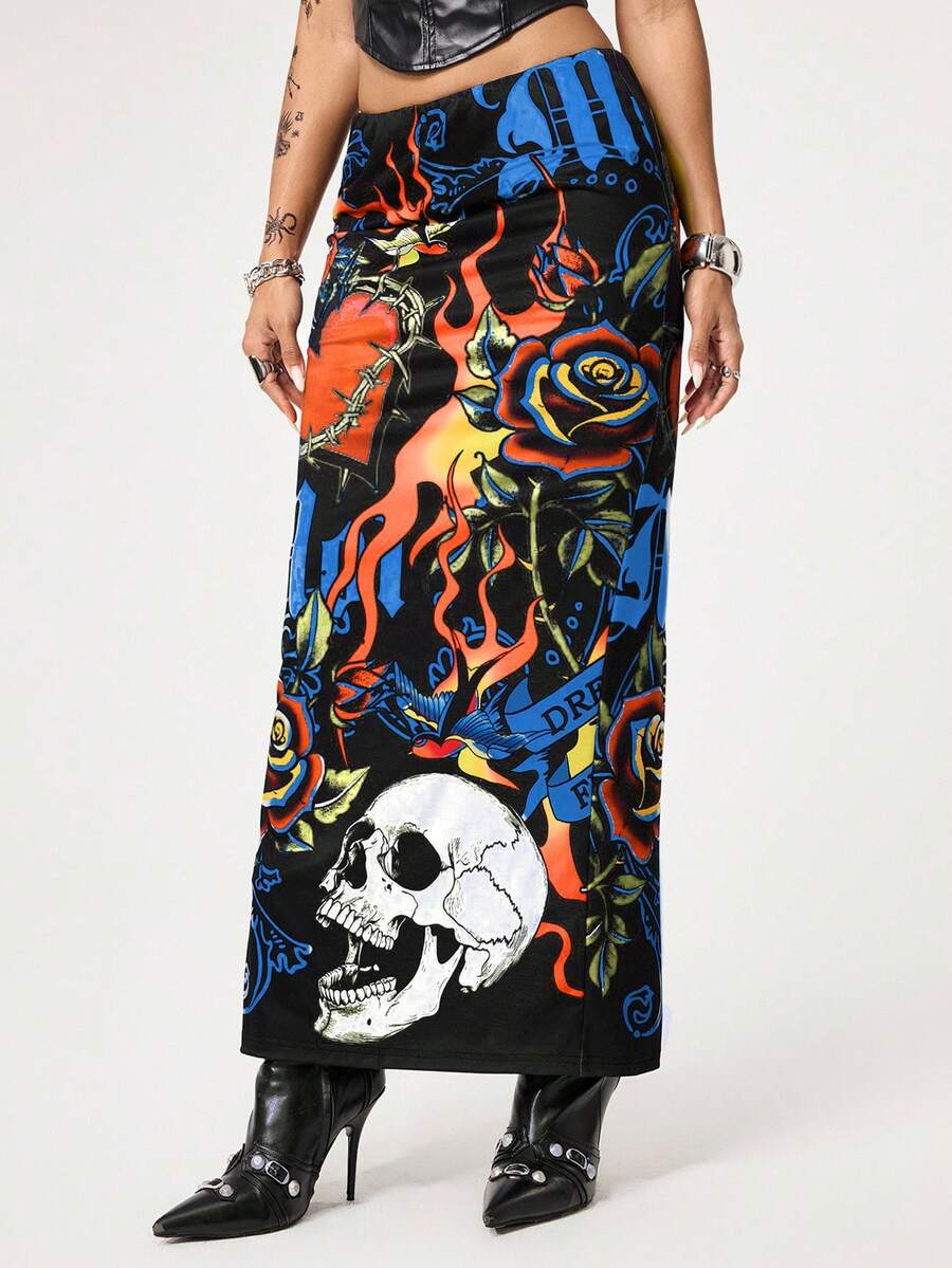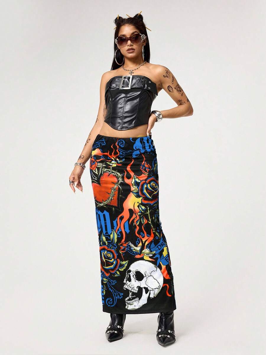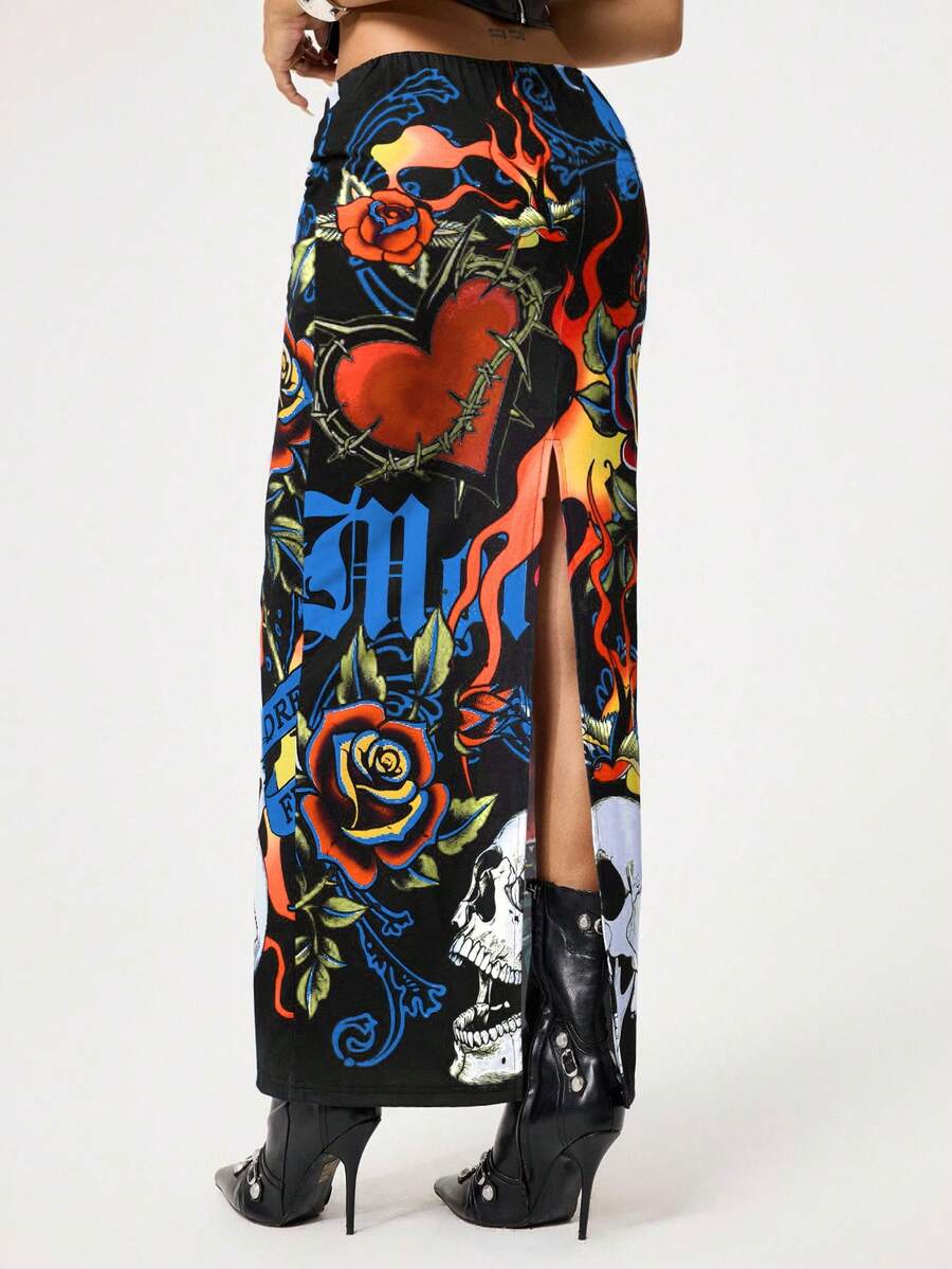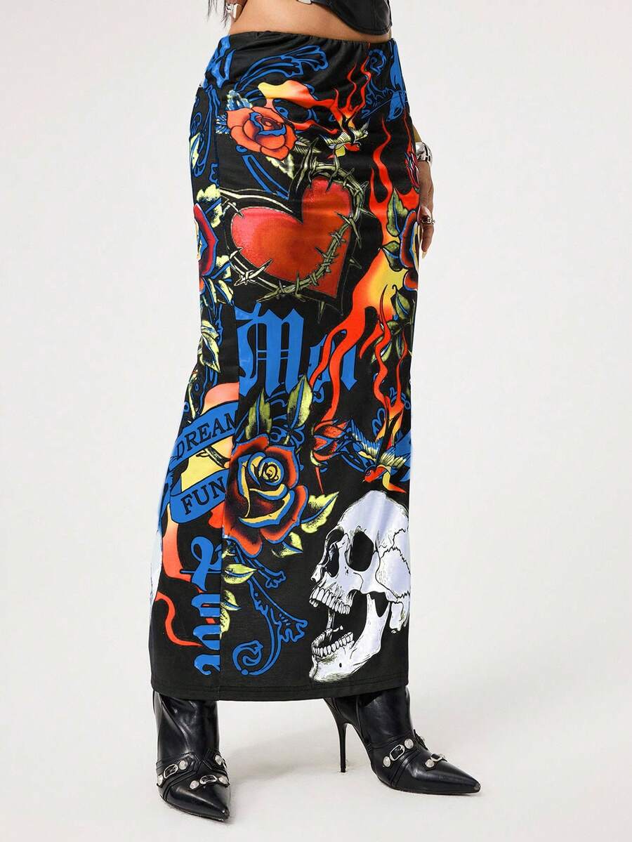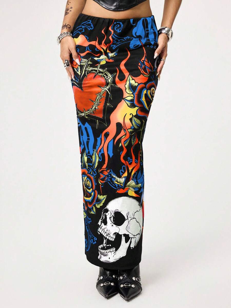 ROMWE Avant Y2K Retro Baddie Skelett Herz Flamme Text Muster Damen Mini Rock