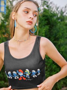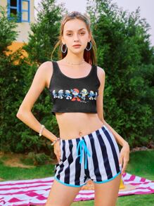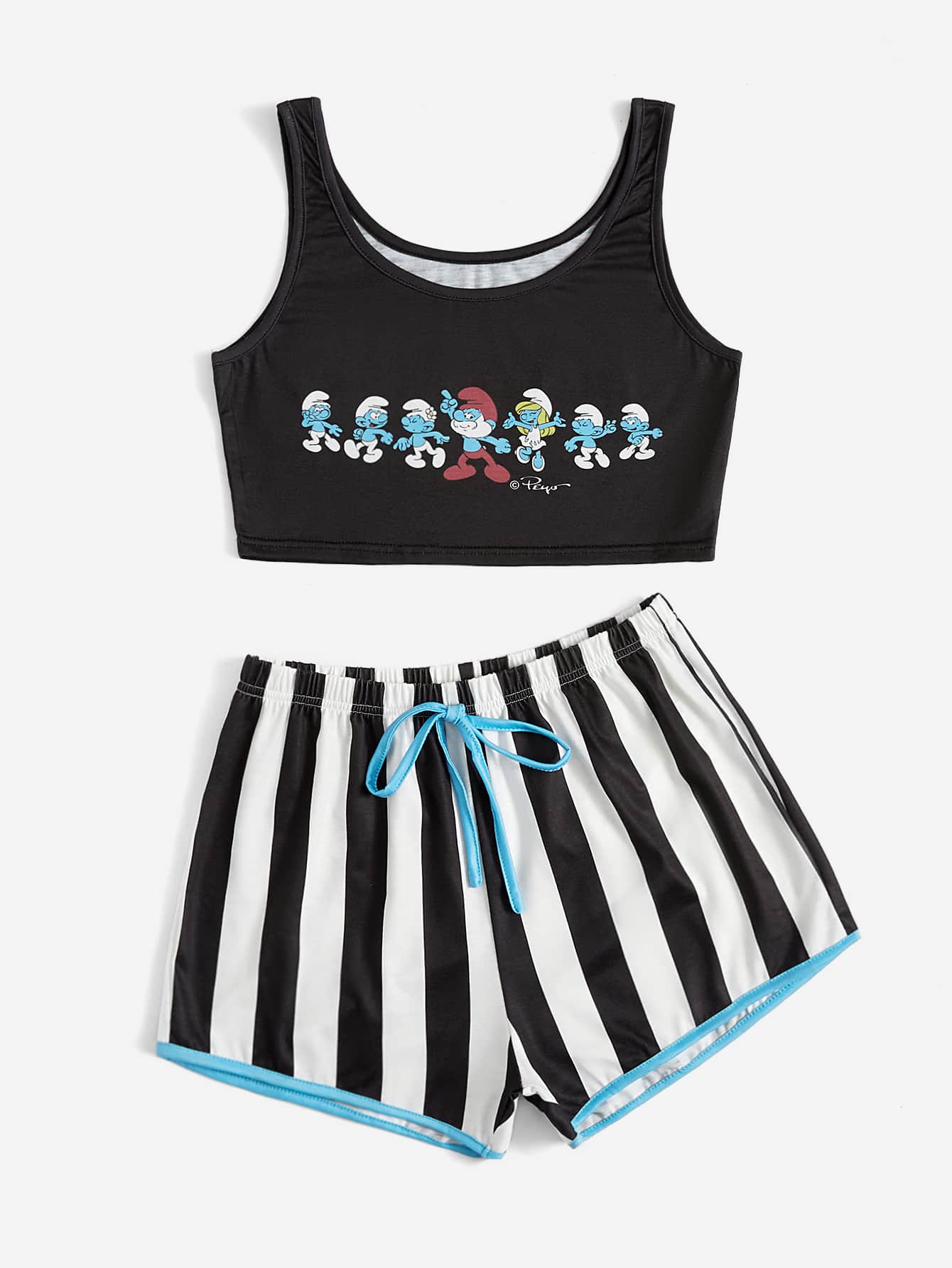 ROMWE X The Smurfs Y2K Revival Pyjama Set mit Cartoon Grafik, Streifen, Knoten