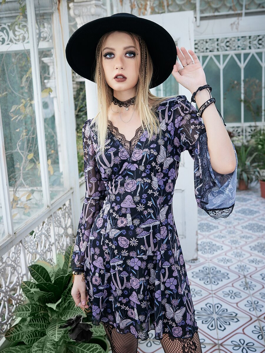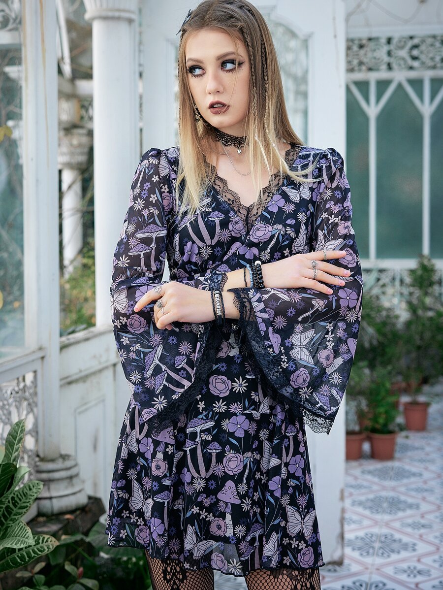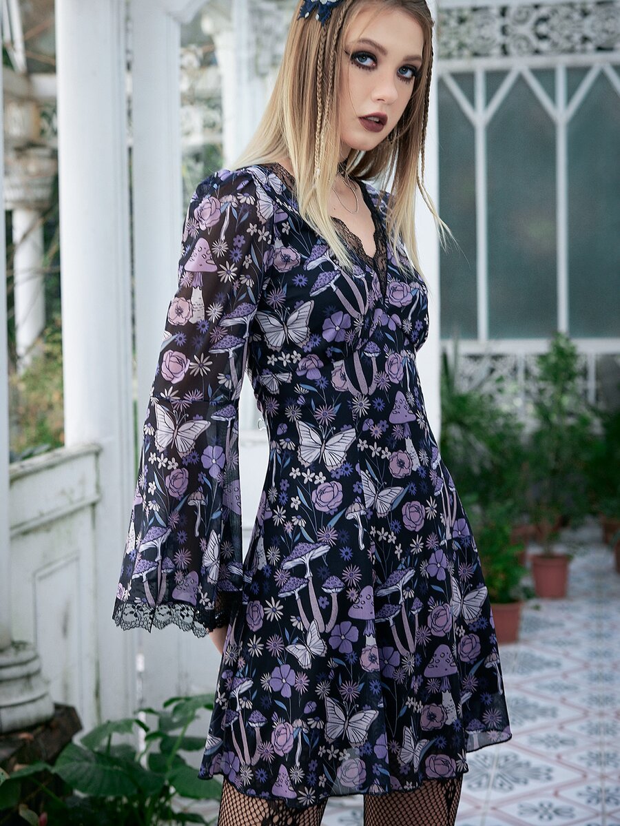 Goth Kleid mit Pilz & Schmetterling Muster, Kontrast Spitzen