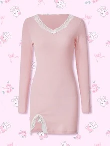 Kawaii Figurbetontes Kleid mit Kontrast Spitzen, Schlitz am Saum
