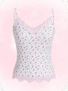 Kawaii Cami Top mit Blümchen Muster, Spitzenbesatz,