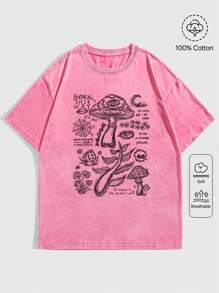 Grunge Punk Retro, verwaschen Dunkel Mushroom & Spinnennetz Spruch bedrucktes Baumwoll T-Shirt mit Rundausschnitt, weite Passform, Kurzarm, Hip-Hop Streetwear, Schule