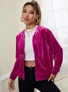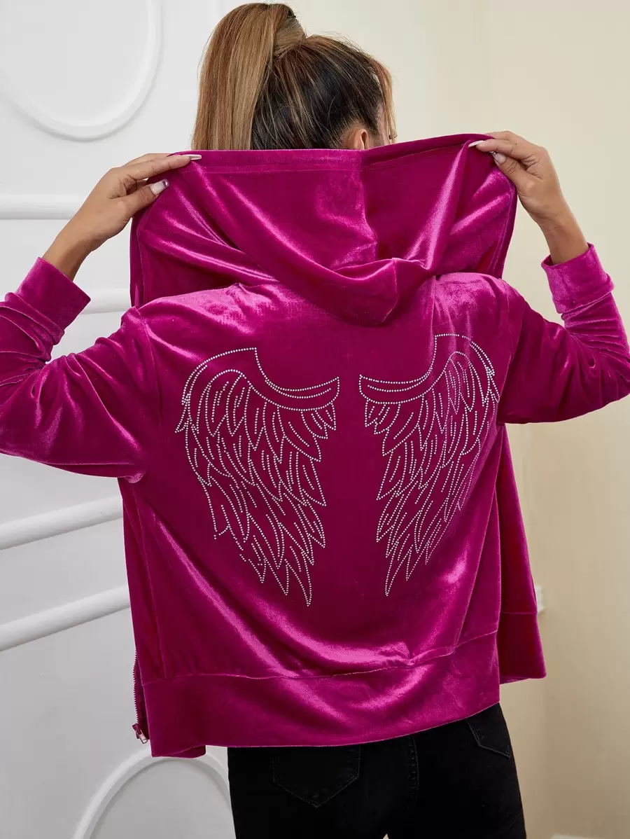 Jacke mit Strass, Flügeln Muster, Reißverschluss, Tunnelzug, Kapuze, Samt
