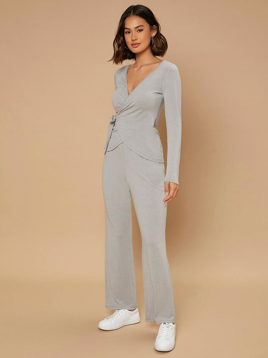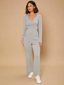 Rippenstrick Pyjama Set mit seitlichem Band und Wickel Design