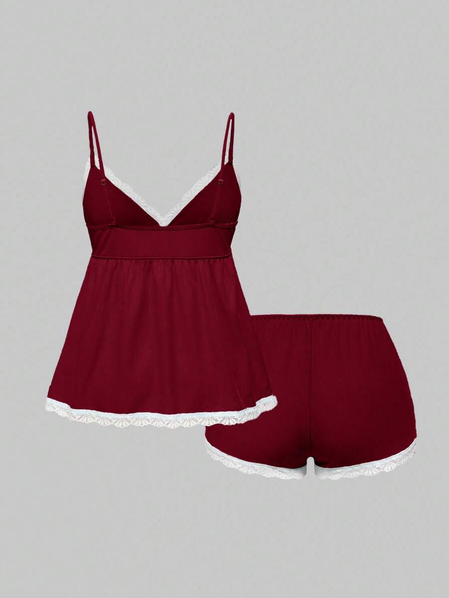 Geripptes Spitzen-Camisole & Shorts Lässig Pyjama Set