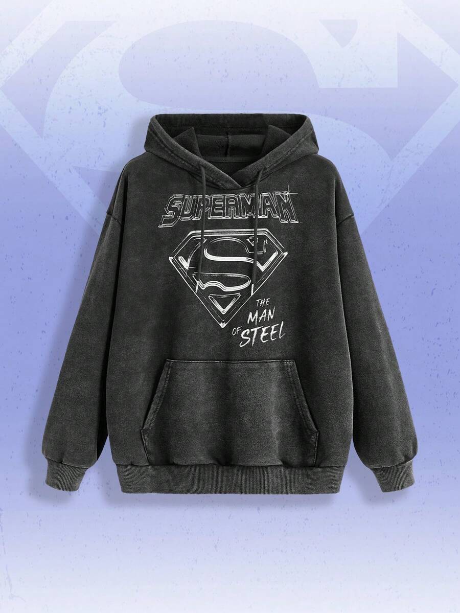 SUPERMAN X ROMWE Logo und Buchstabe grafisch im abgenutzten Stil Kapuzenpullover mit Kordelzug, Langarm Oberteile