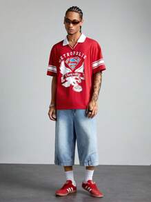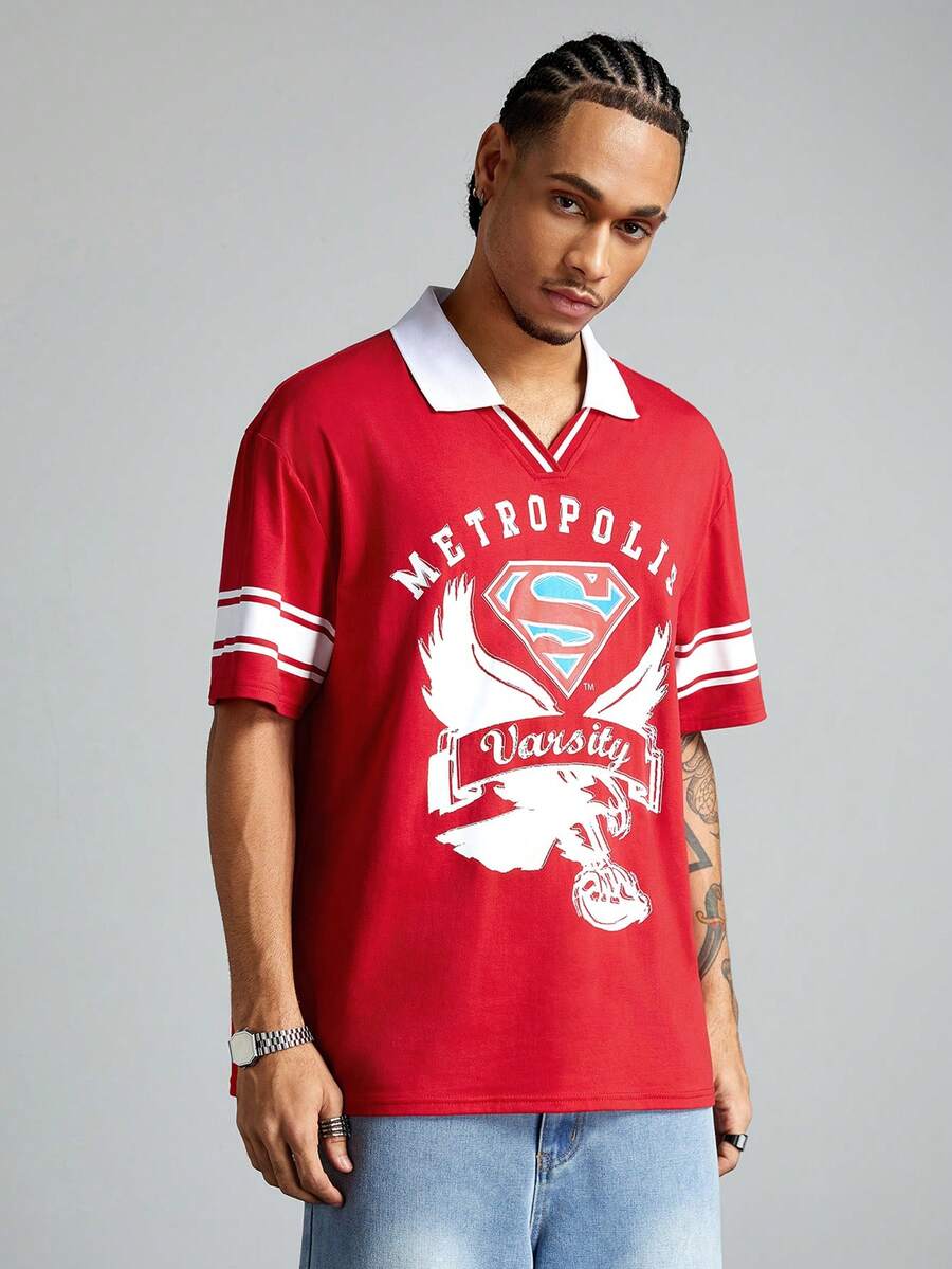 SUPERMAN X ROMWE Herren lässiges V-Ausschnitt Kurzarm T-Shirt mit Adler- und Buchstaben-Muster, Sommer