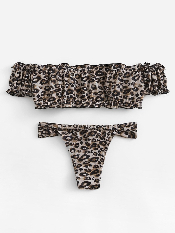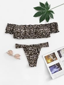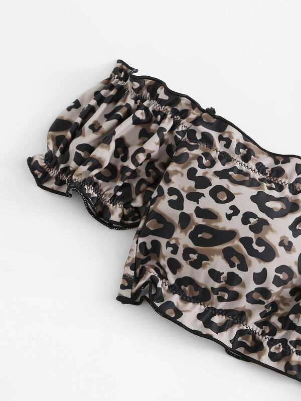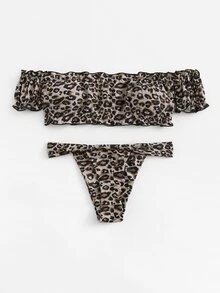 Schulterfreie Bikini Set mit Plissee und Leopard Muster