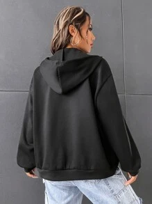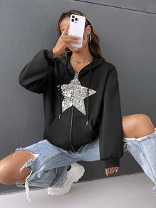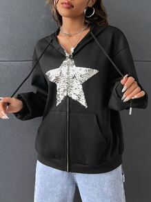 Hoodie mit Paillette, Stern Muster, Drop Shoulder Reißverschluss, Tunnelzug