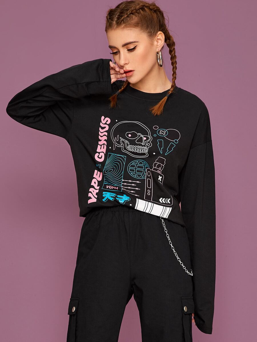T-Shirt mit Skelett & Buchstaben Muster und langen Ärmeln