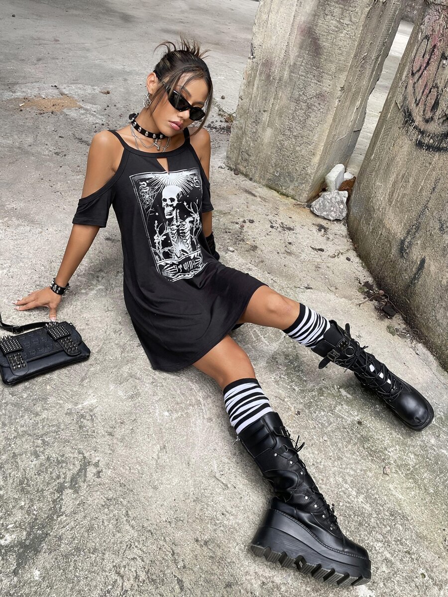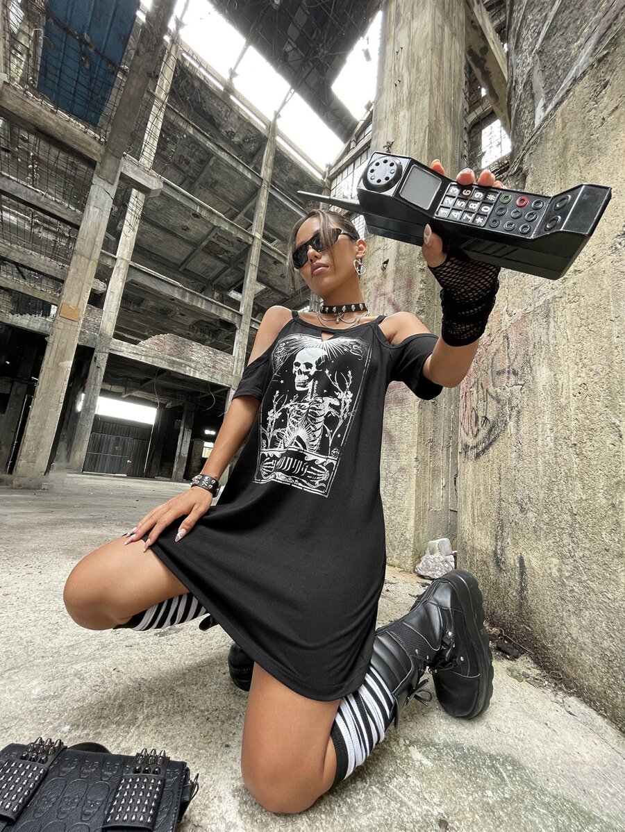 Kleid mit Skelett & Spinnennetz Muster, Ausschnitt, ohne Handschuhe
