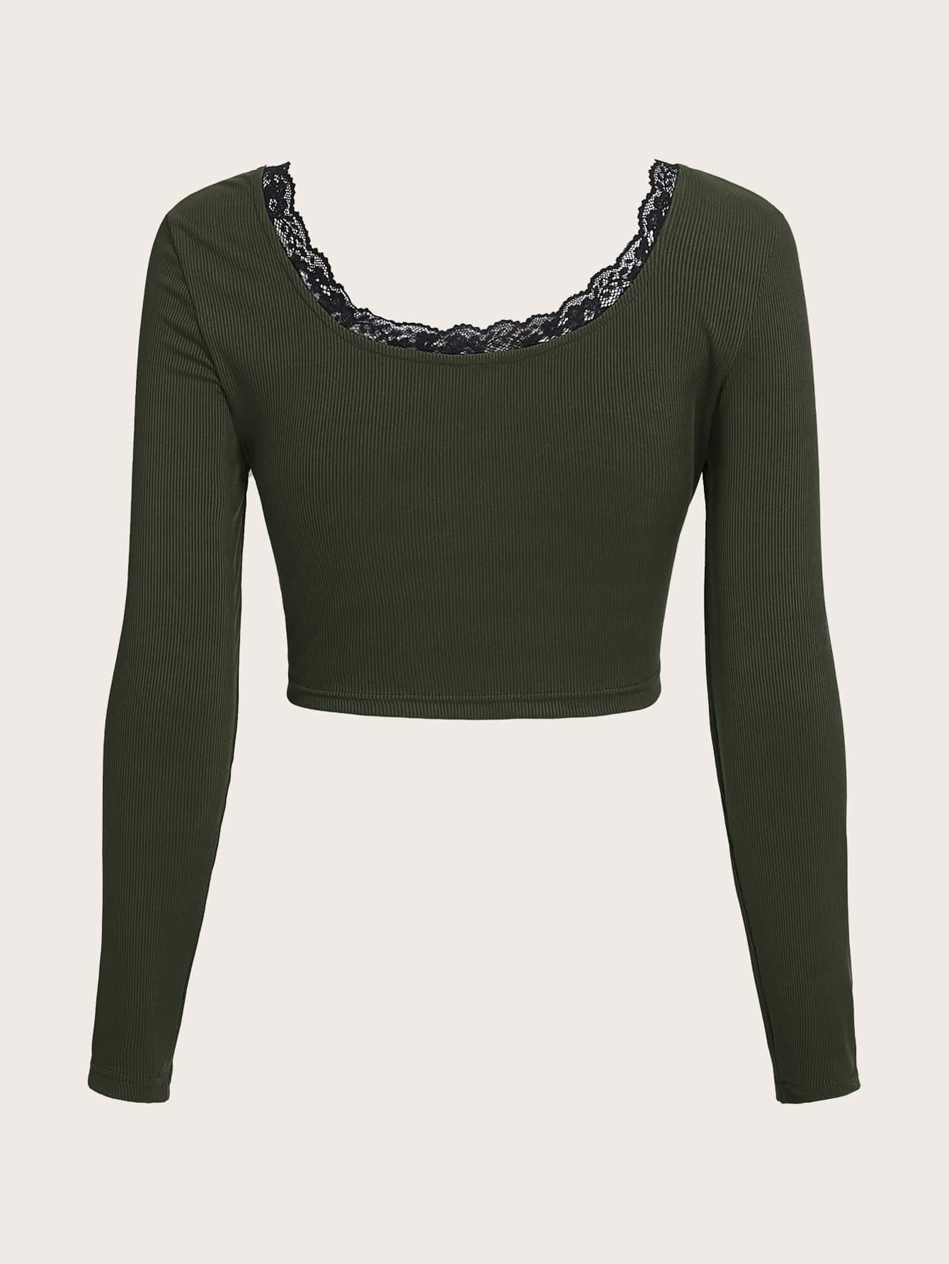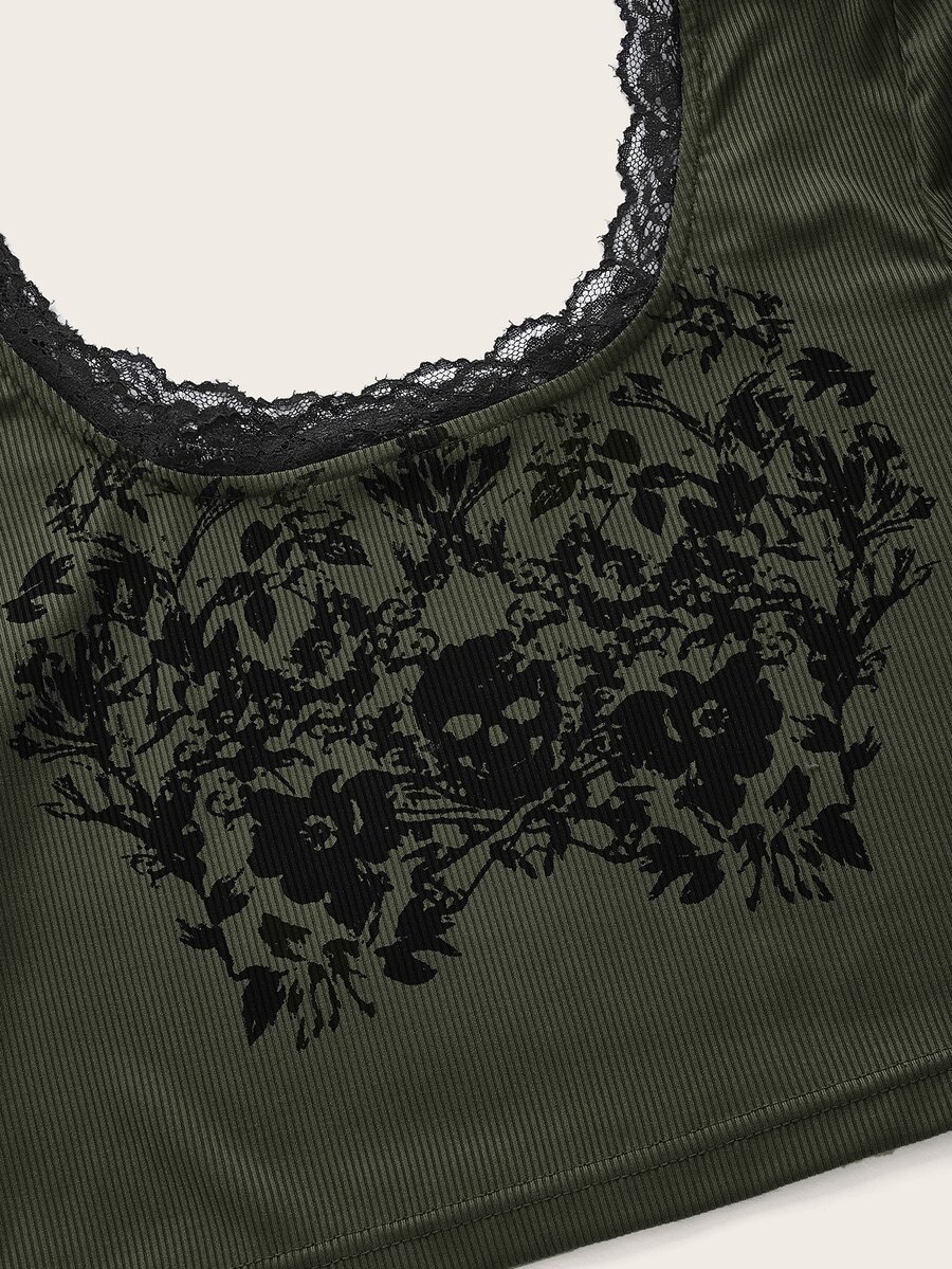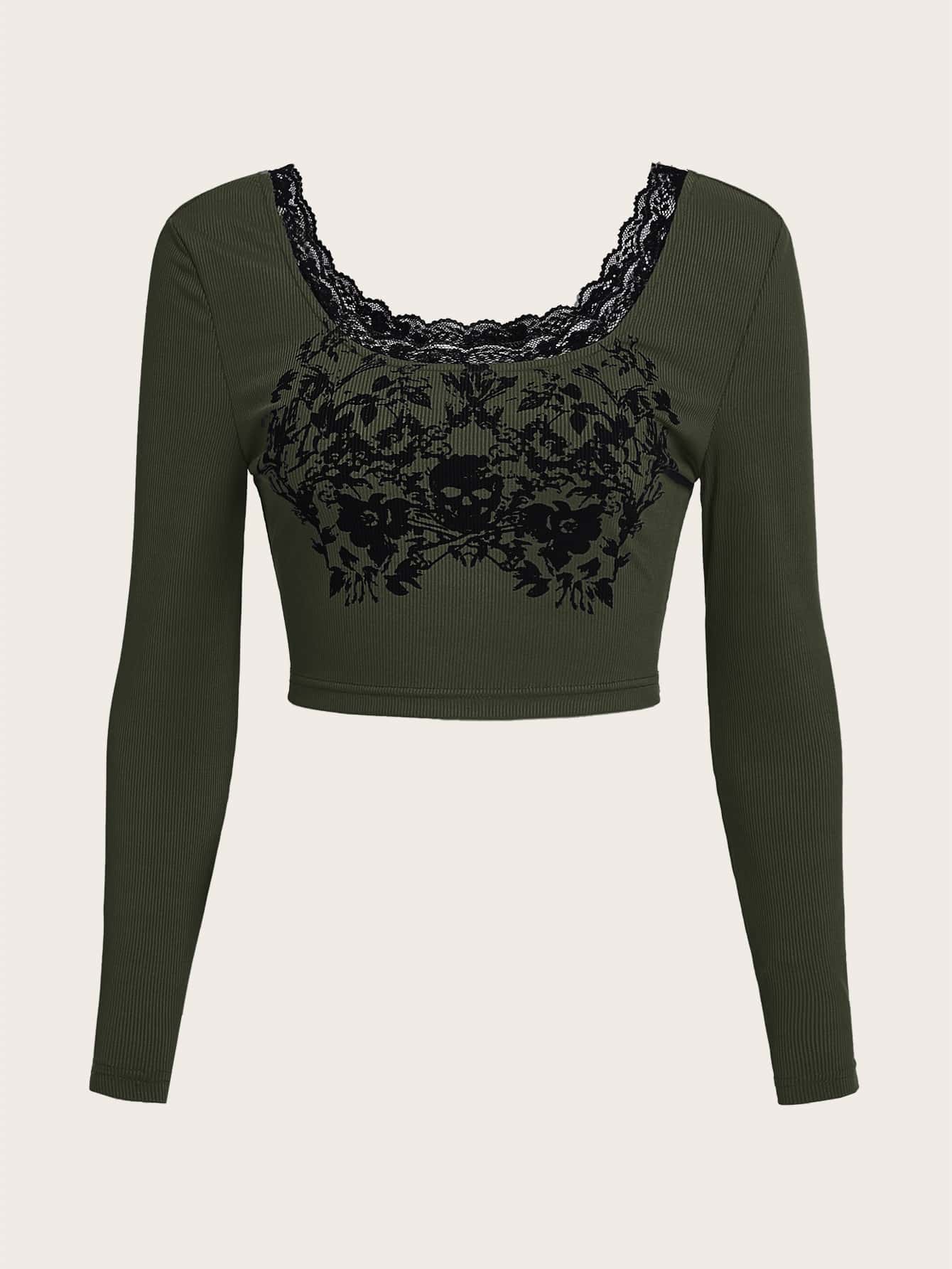 Crop T-Shirt mit Schädel Grafik, Kontrast Spitzen