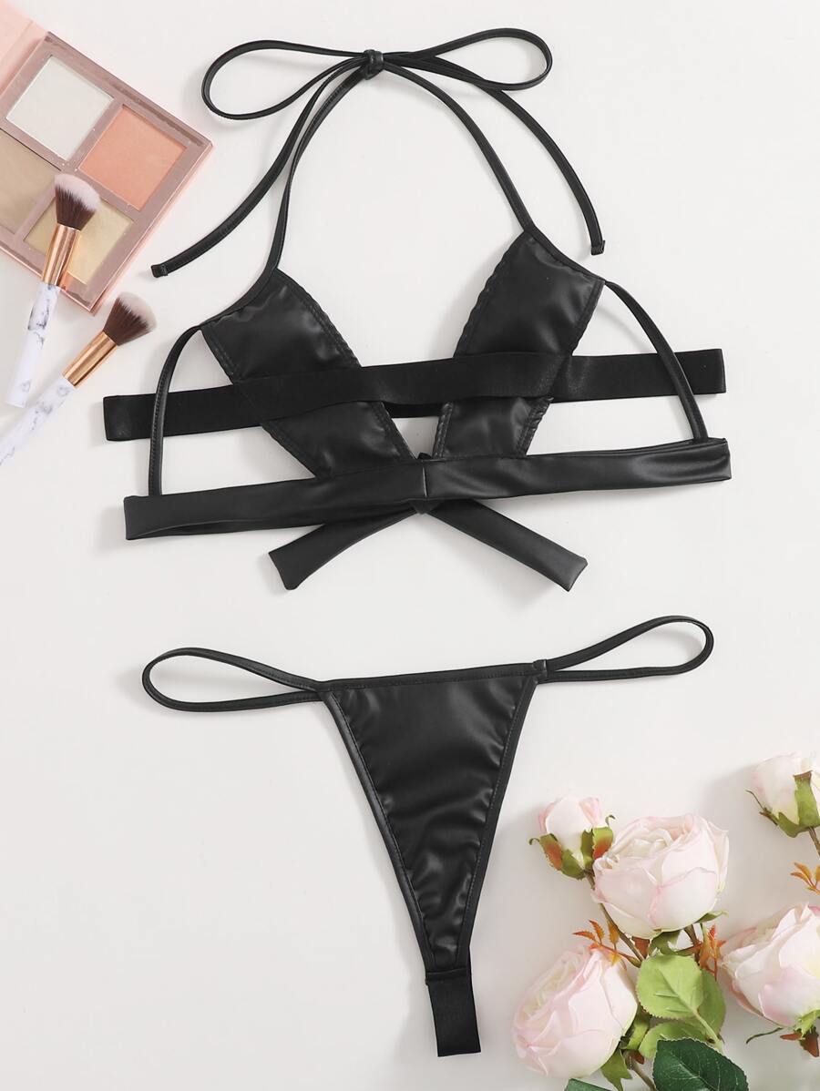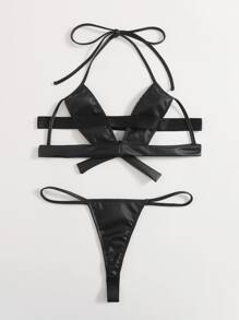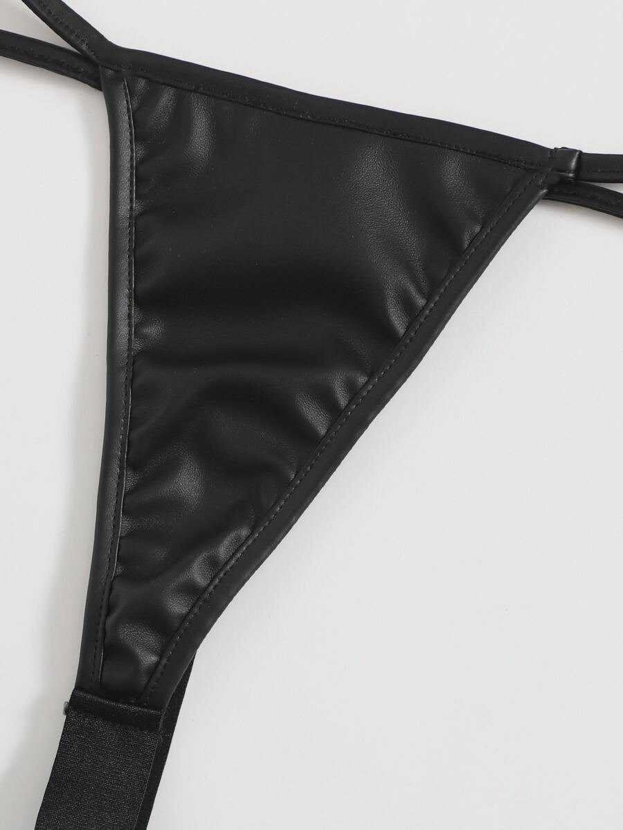 Einfarbige PU Leder Dessous Set mit Ausschnitt