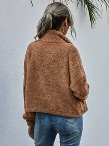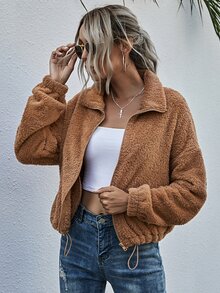 Einfarbige Crop Teddy Jacke mit Kordelzug