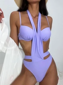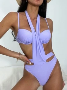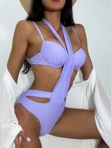 Einfarbiges Bikini Set mit Halterung und Ausschnitt